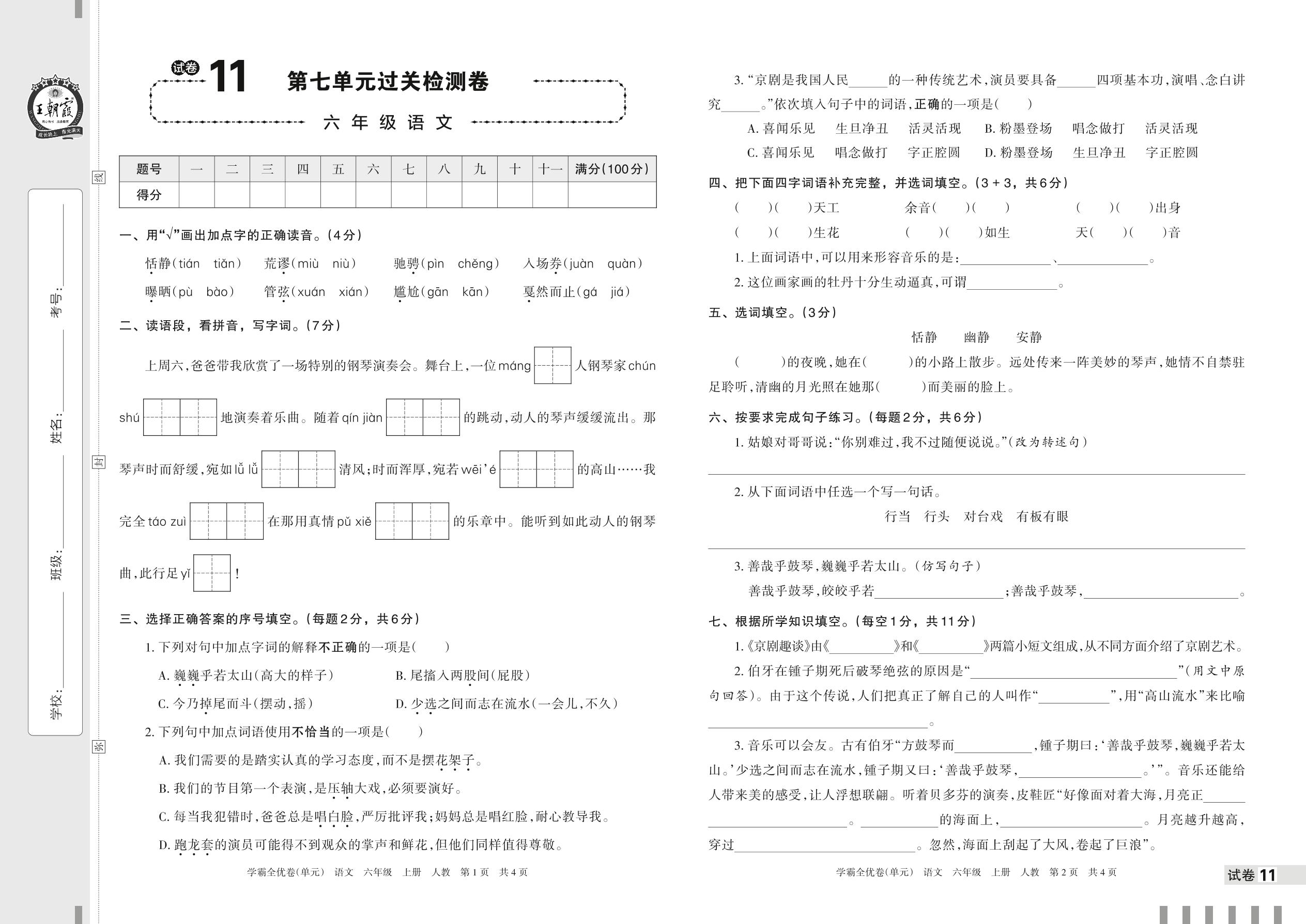 2022上册六年级语文人教版 试卷11 第七单元过关检测卷