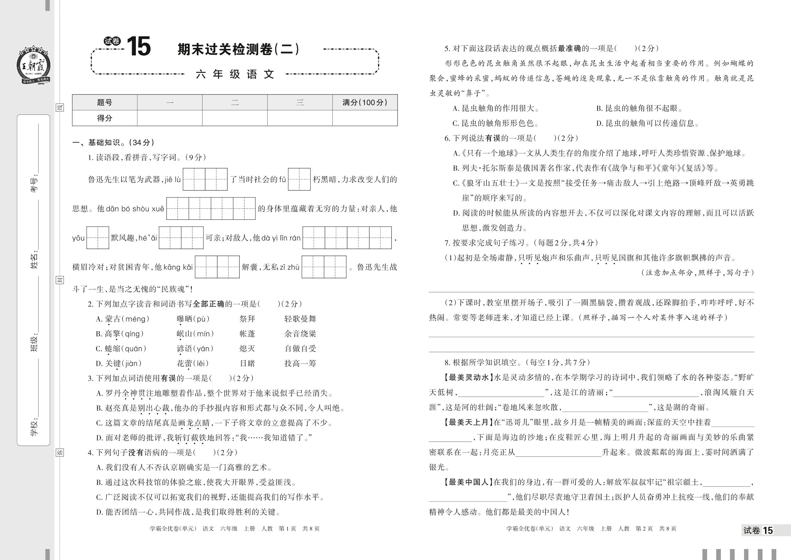 2022上册六年级语文人教版 试卷15 期末过关检测卷(二)