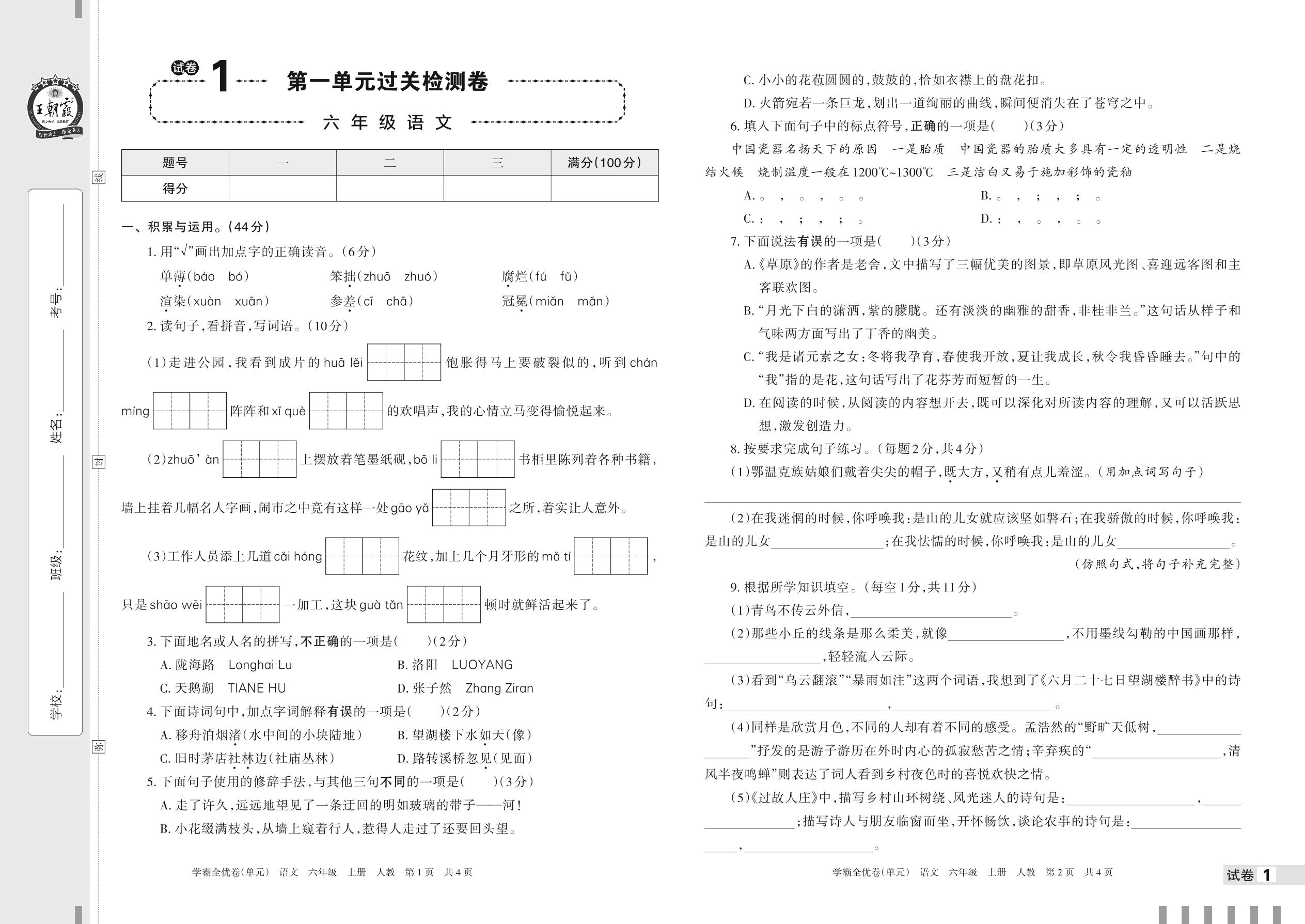 2022上册六年级语文人教版 试卷1 第一单元过关检测卷