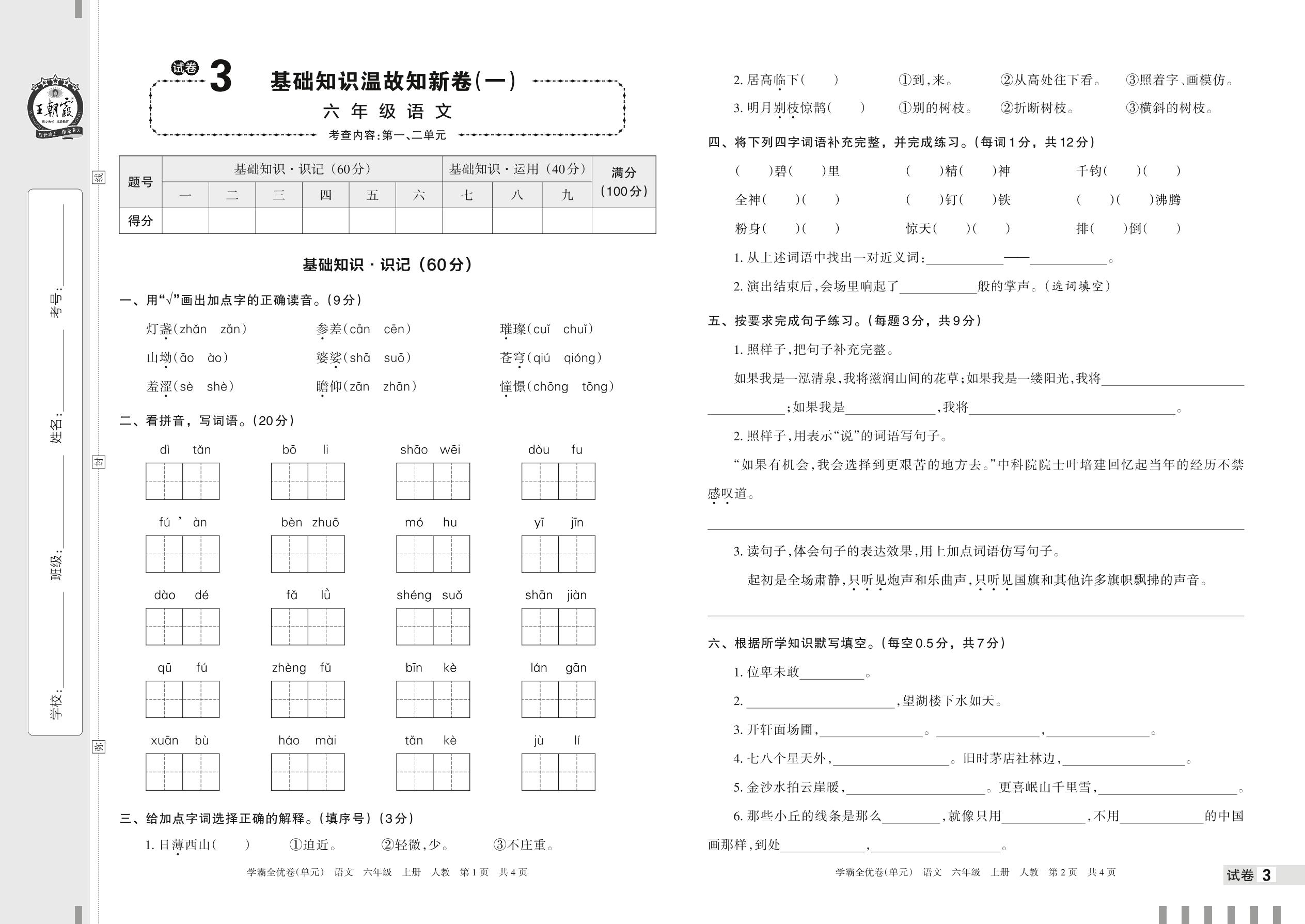 2022上册六年级语文人教版 试卷3 基础知识温故知新卷(一)