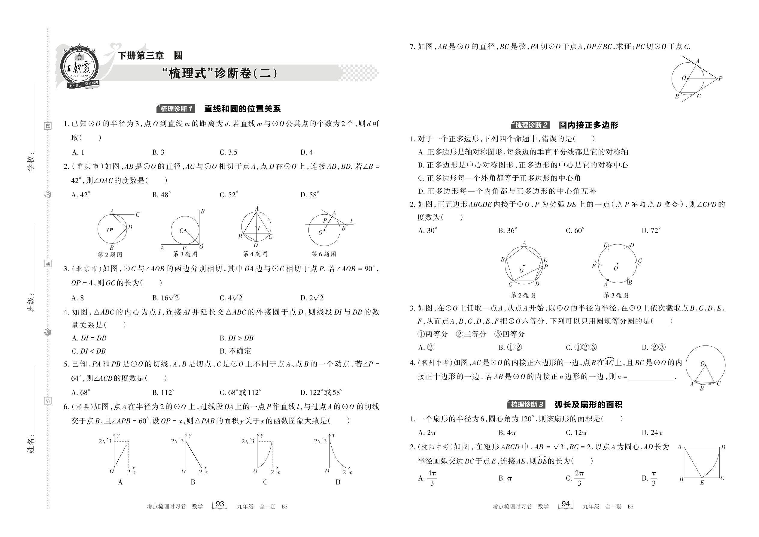2023下册九年级数学北师版 第三章 “梳理式”诊断卷(二)