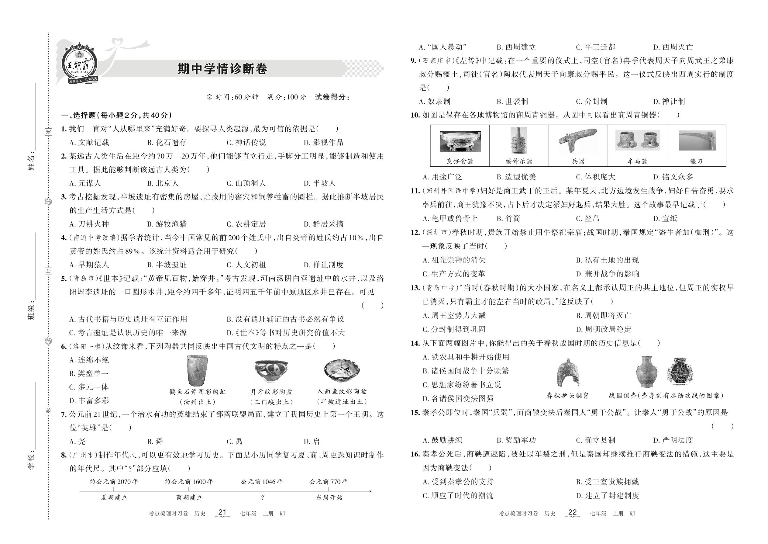 2022上册七年级历史人教版 期中学情诊断卷