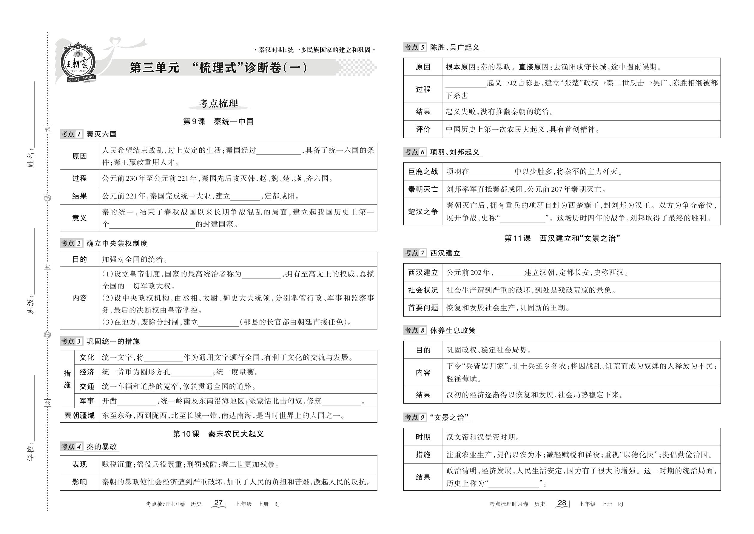 2022上册七年级历史人教版 第三单元 “梳理式”诊断卷(一)