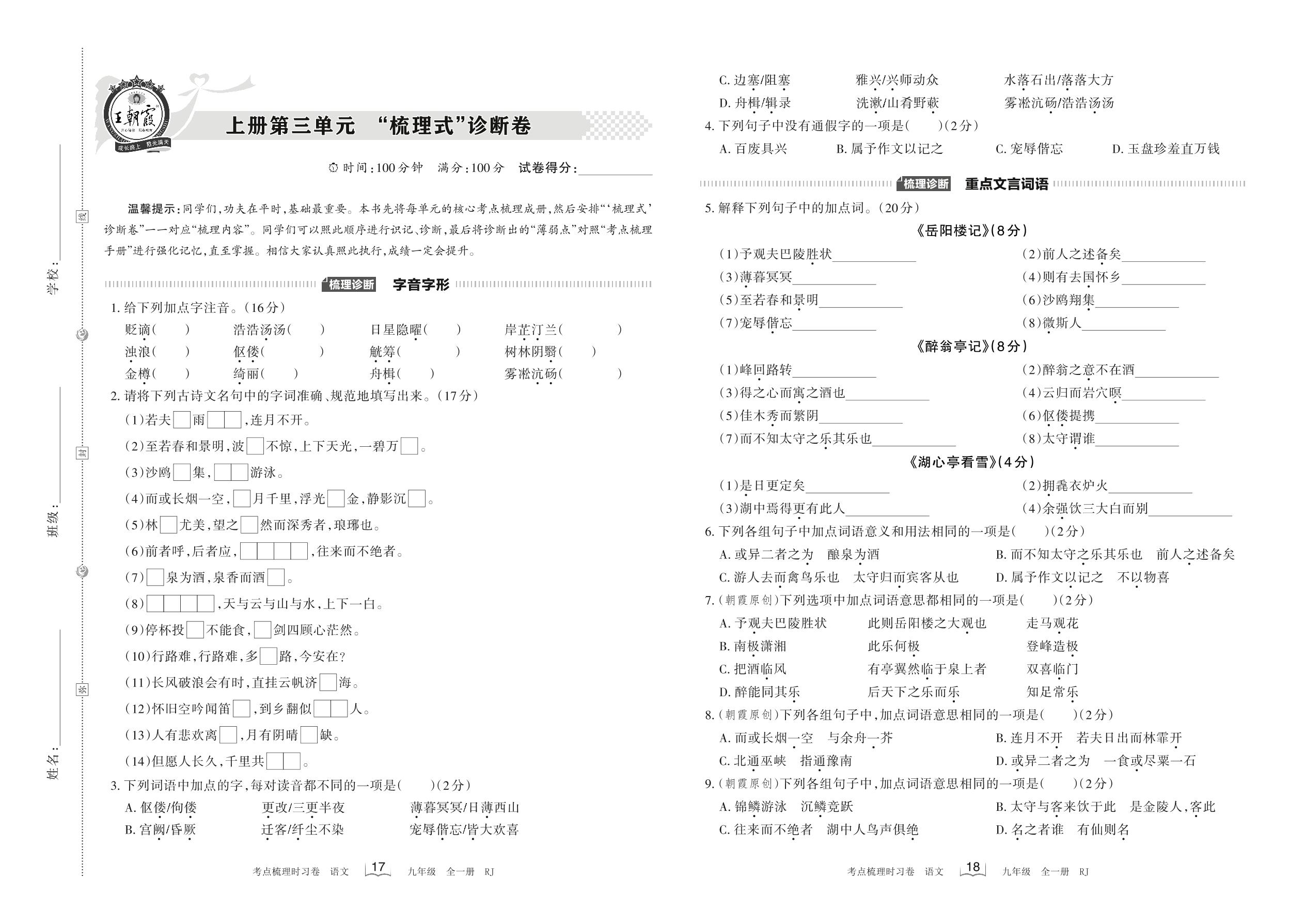 2022上册九年级语文人教版 第三单元 “梳理式”诊断卷