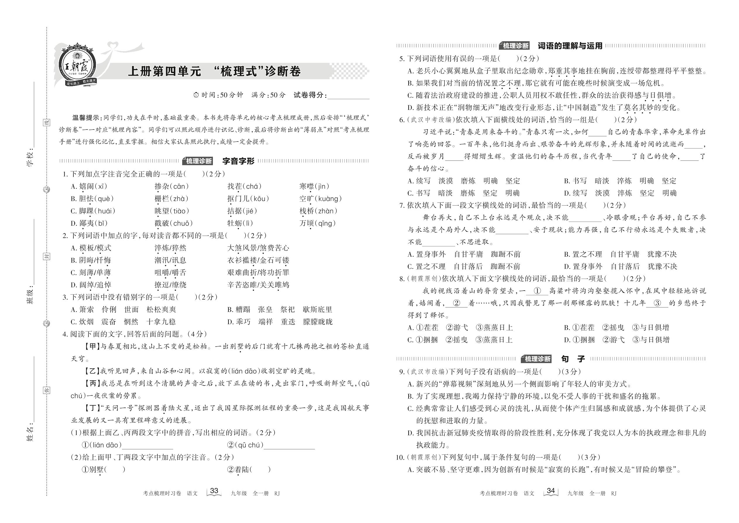 2022上册九年级语文人教版 第四单元 “梳理式”诊断卷