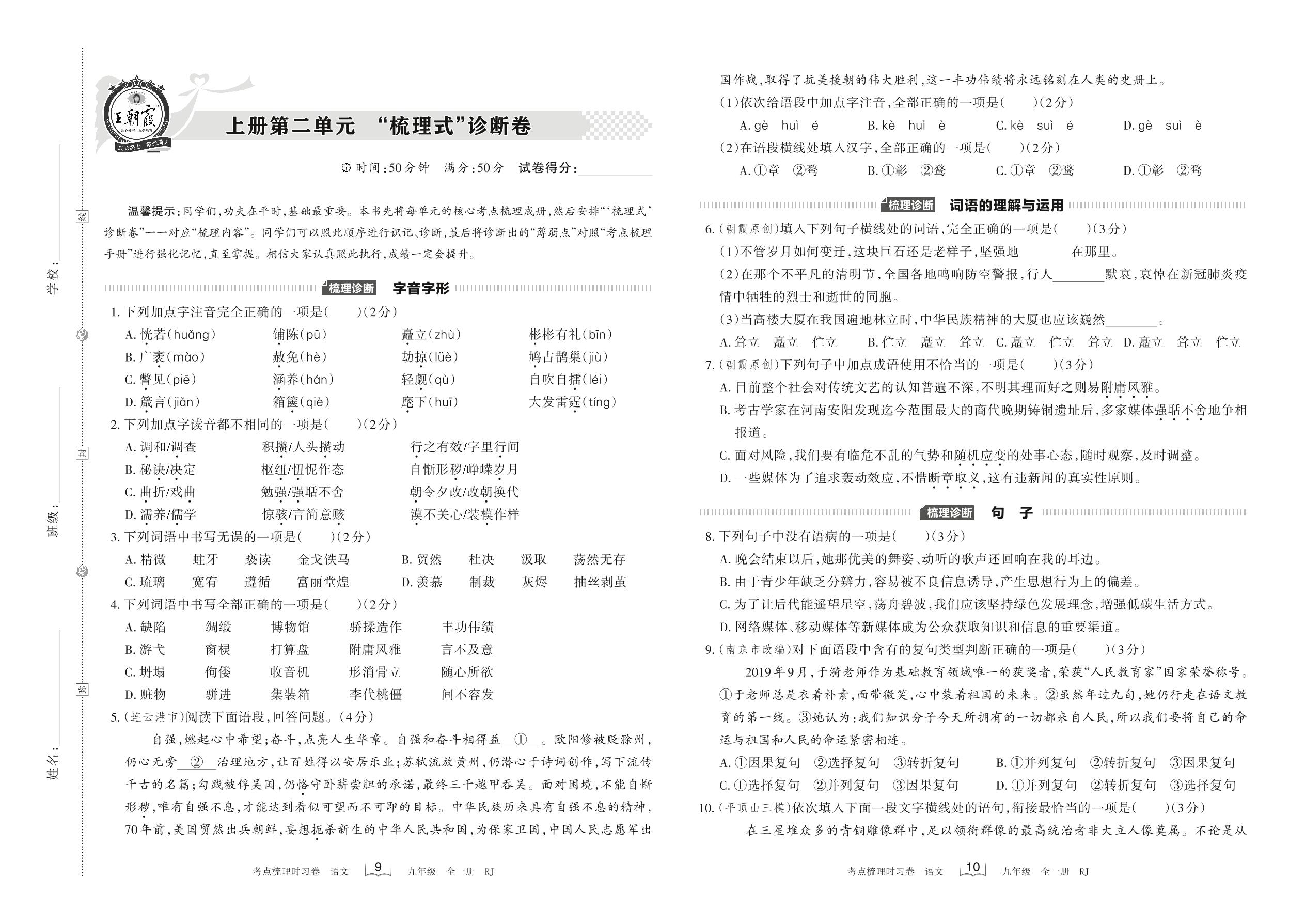 2022上册九年级语文人教版 第二单元 “梳理式”诊断卷