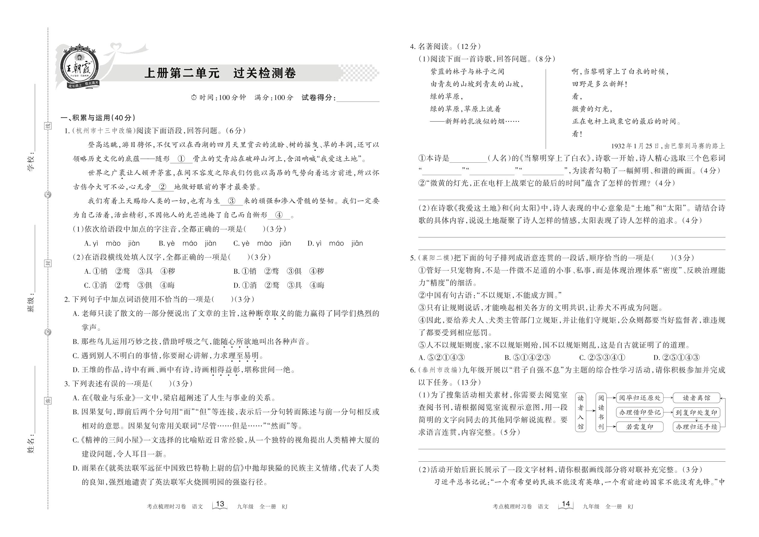 2022上册九年级语文人教版 第二单元 过关检测卷