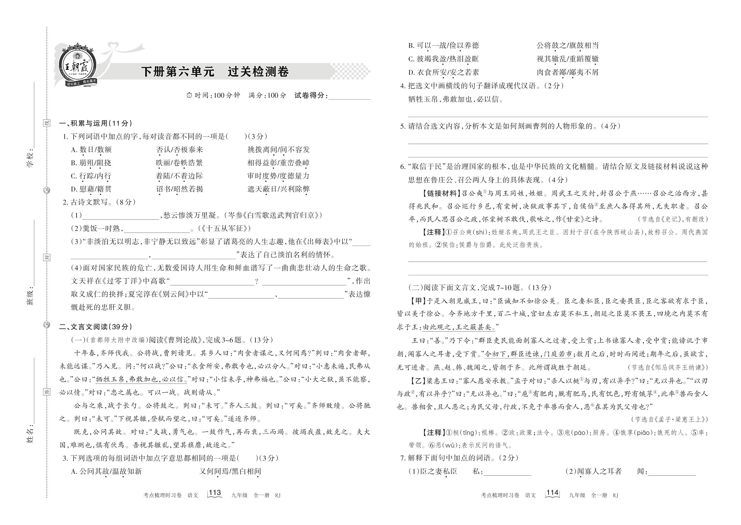2023下册九年级语文人教版 第六单元 过关检测卷