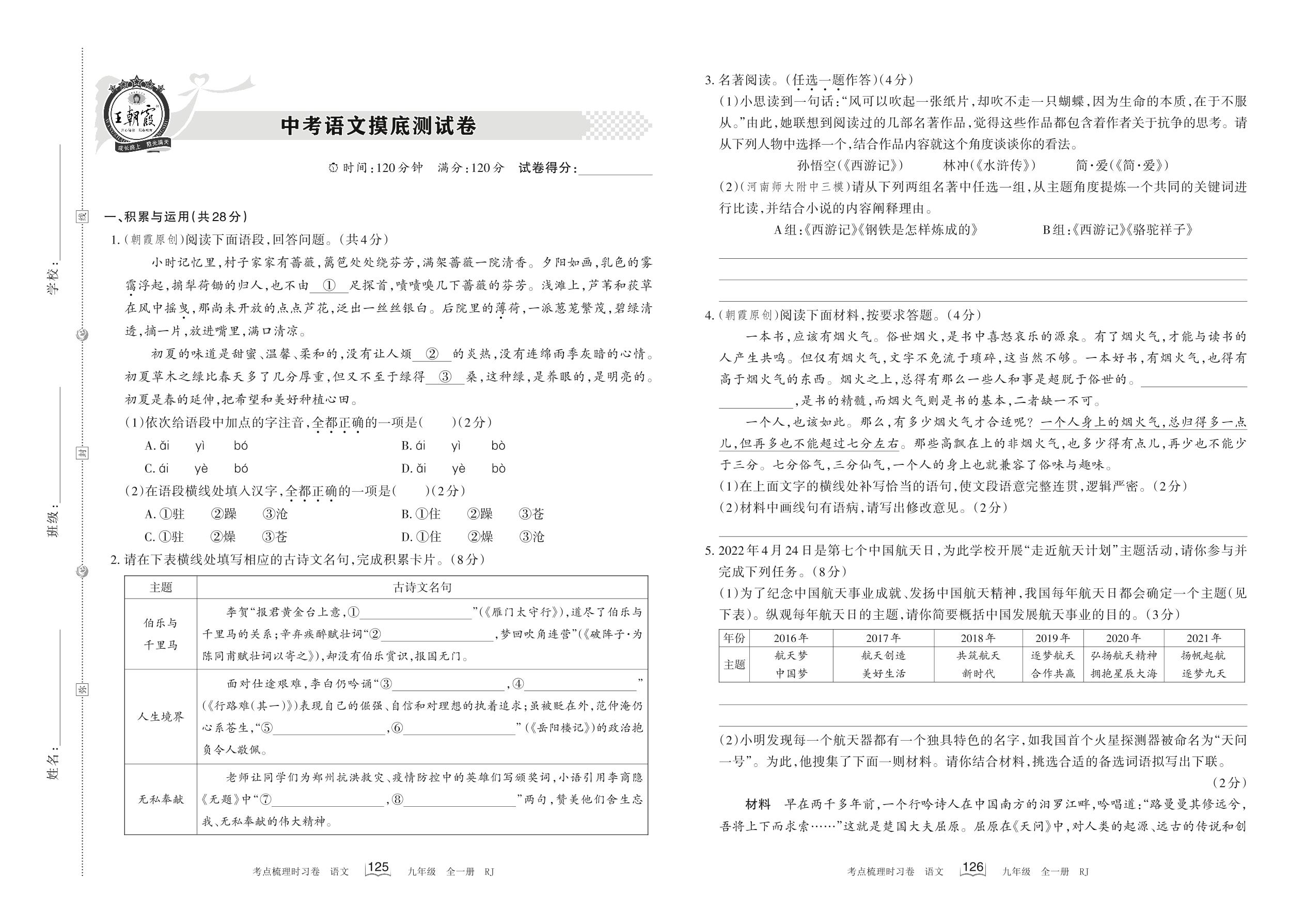 2023下册九年级语文人教版 中考语文摸底测试卷