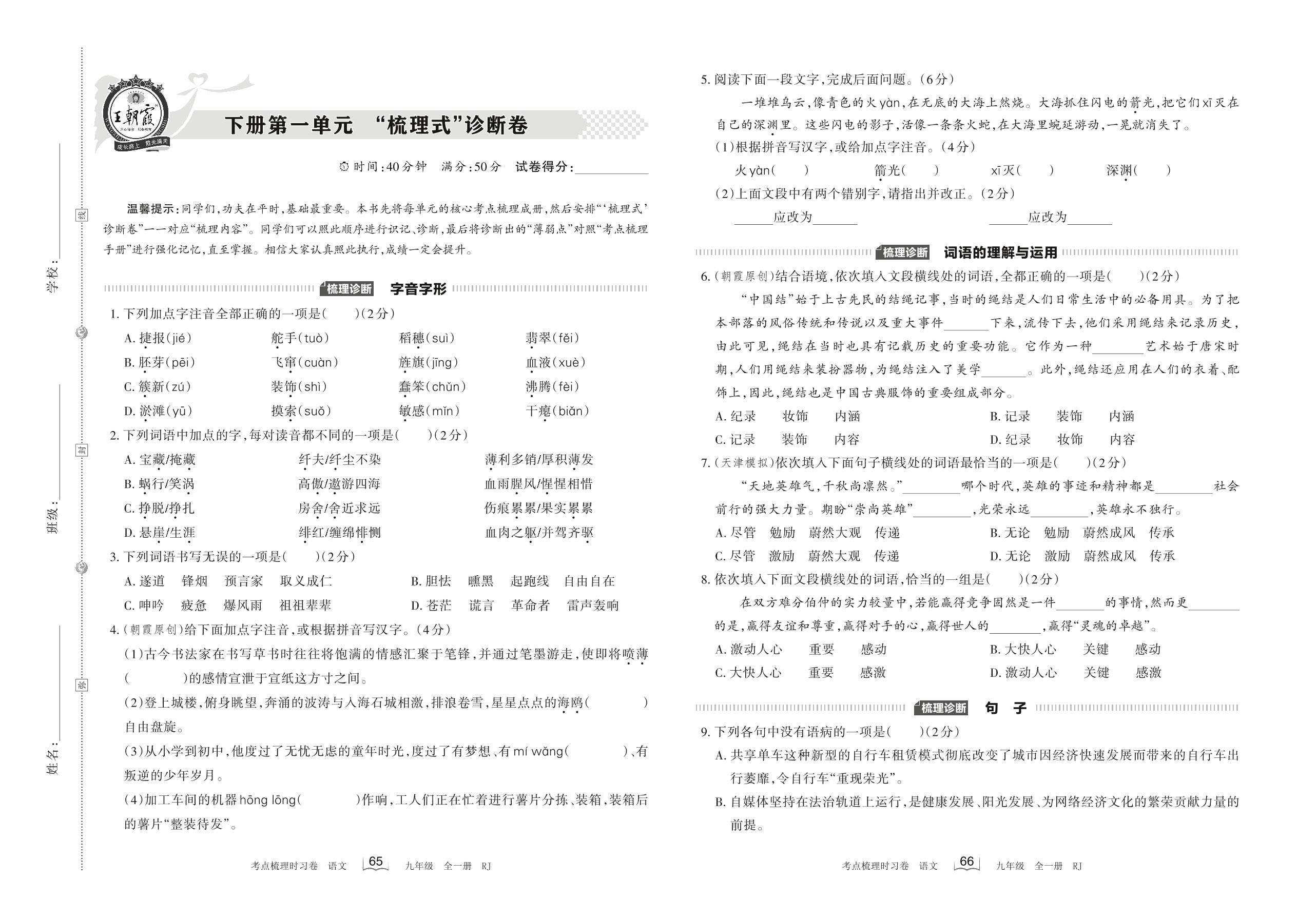 2023下册九年级语文人教版 第一单元 “梳理式”诊断卷
