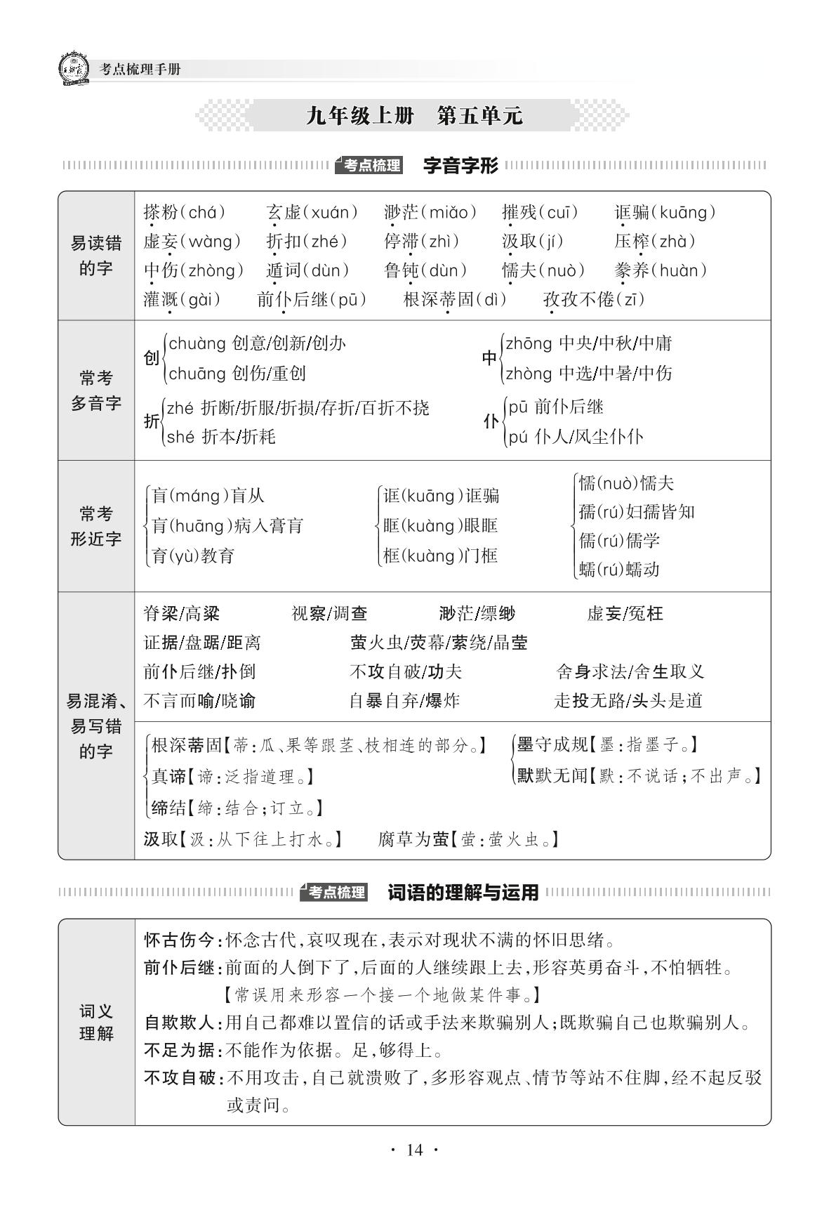 2022上册九年级语文人教版 考点梳理手册——九年级上册 第五单元
