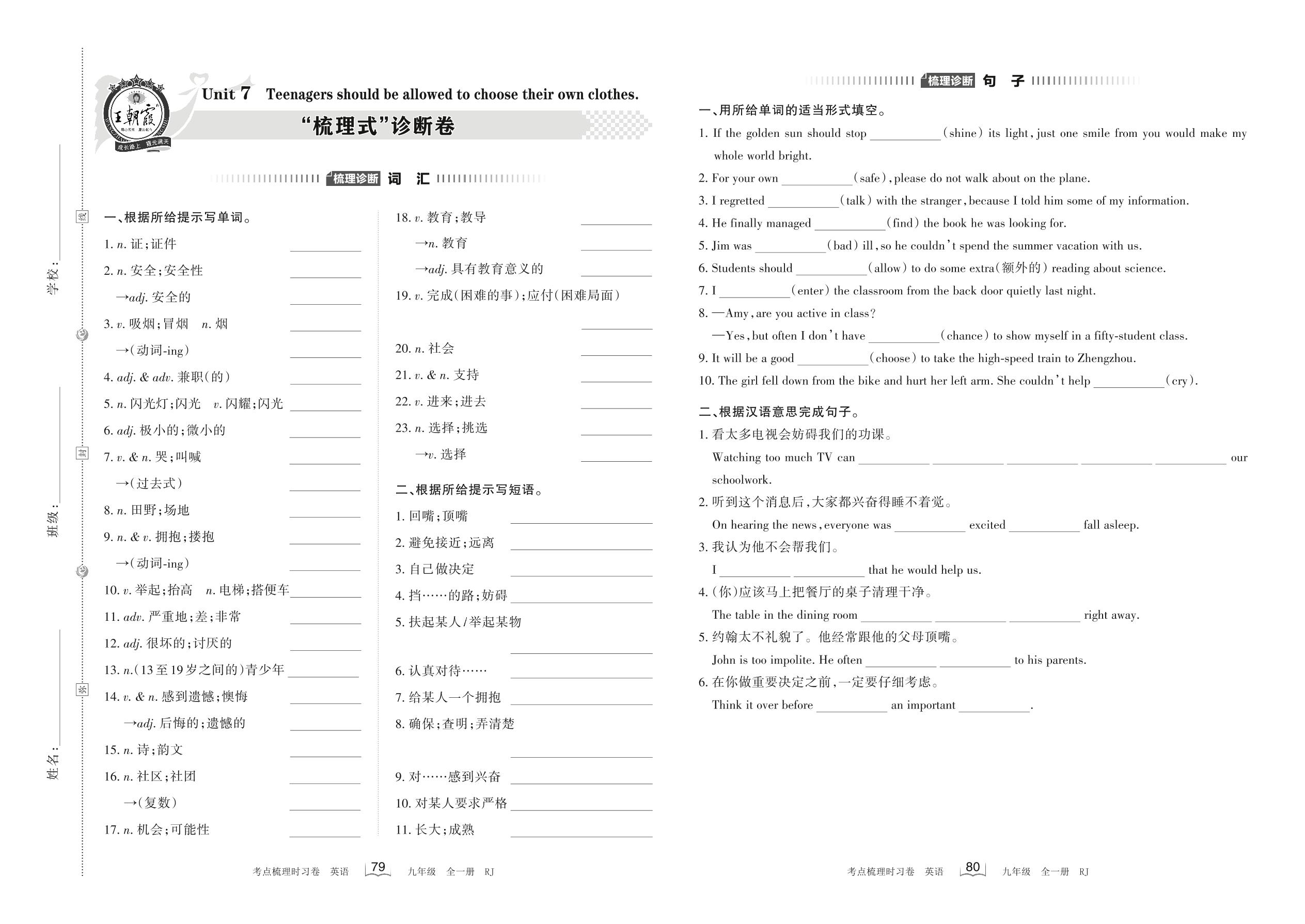 2022-2023学年九年级英语人教版 Unit 7 “梳理式”诊断卷