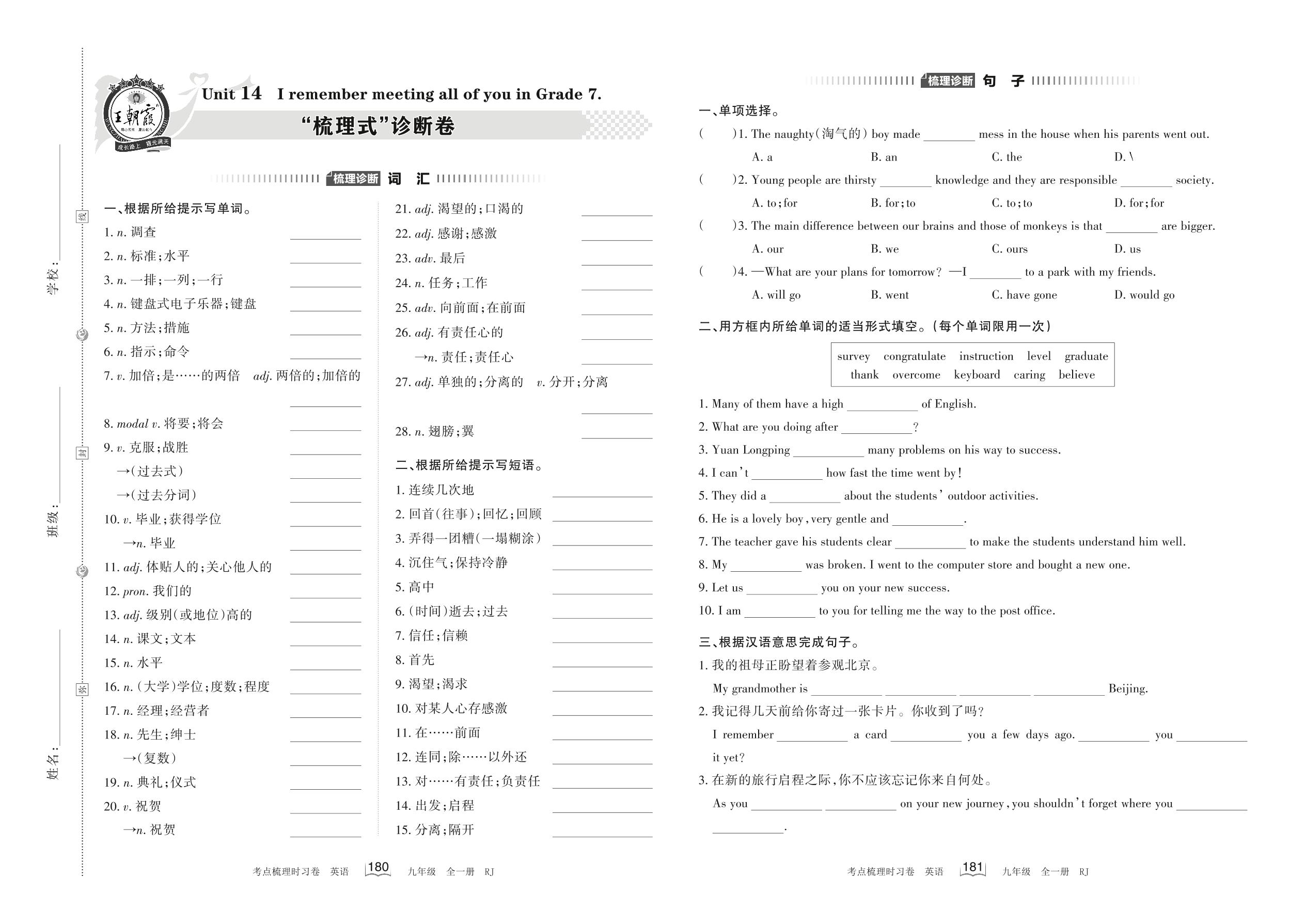 2022-2023学年九年级英语人教版 Unit 14 “梳理式”诊断卷