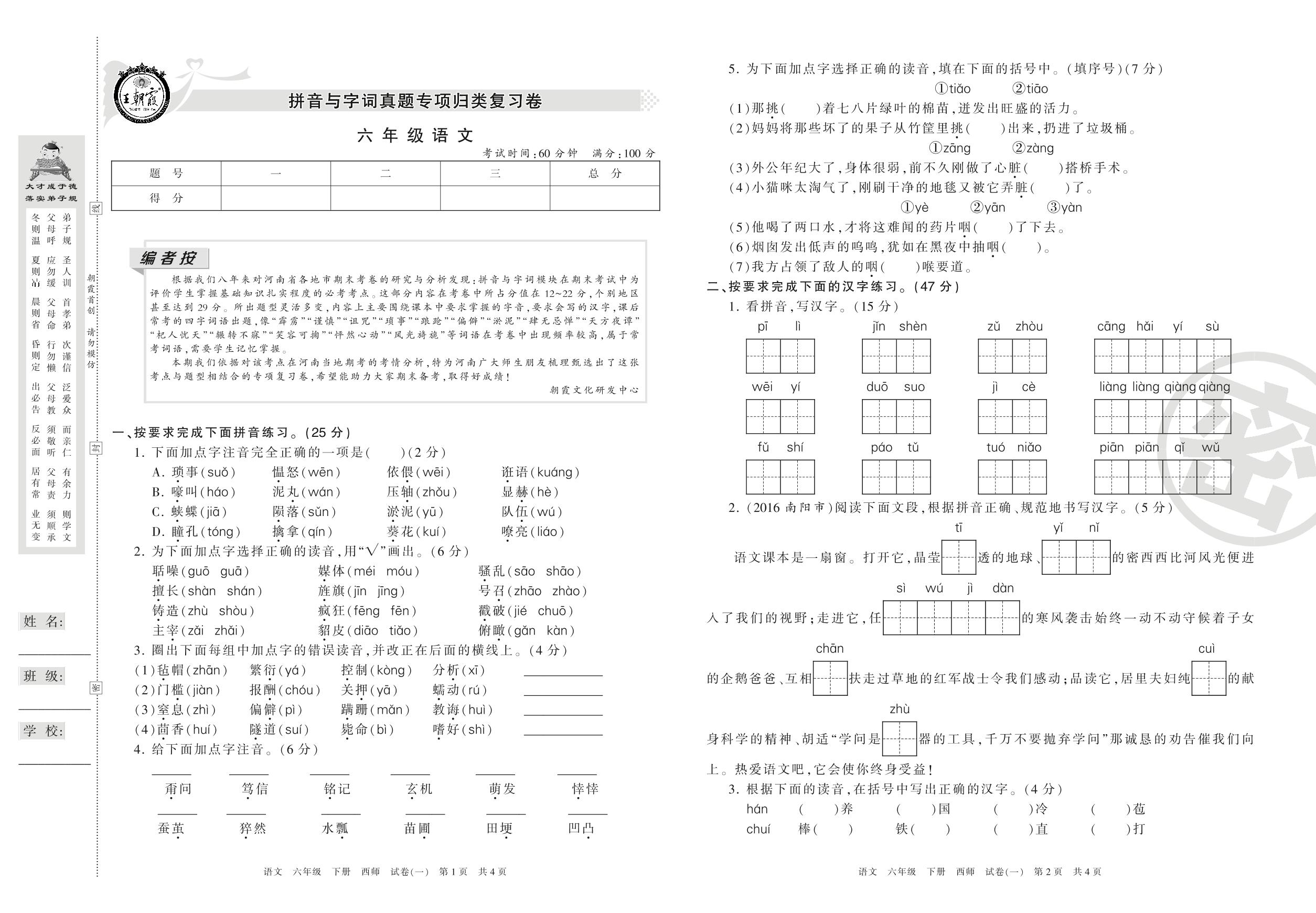 王朝霞期末专项卷六年级下册语文(西师版)_R21080283311【1】