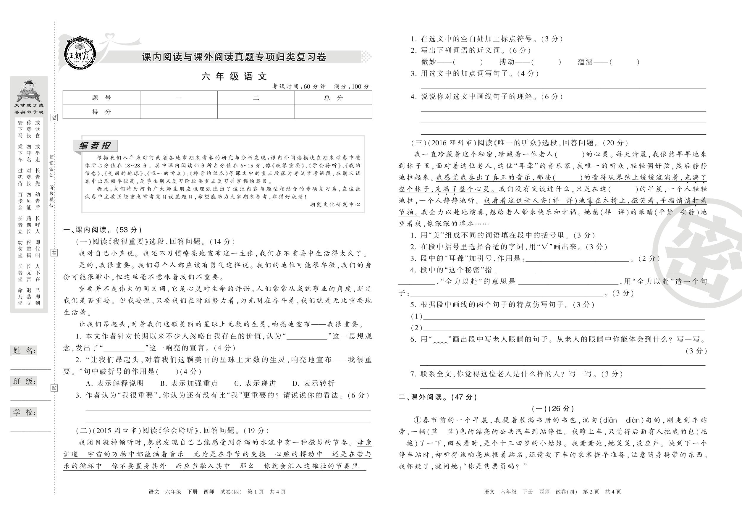 王朝霞期末专项卷六年级下册语文(西师版)_R21080283331【4】