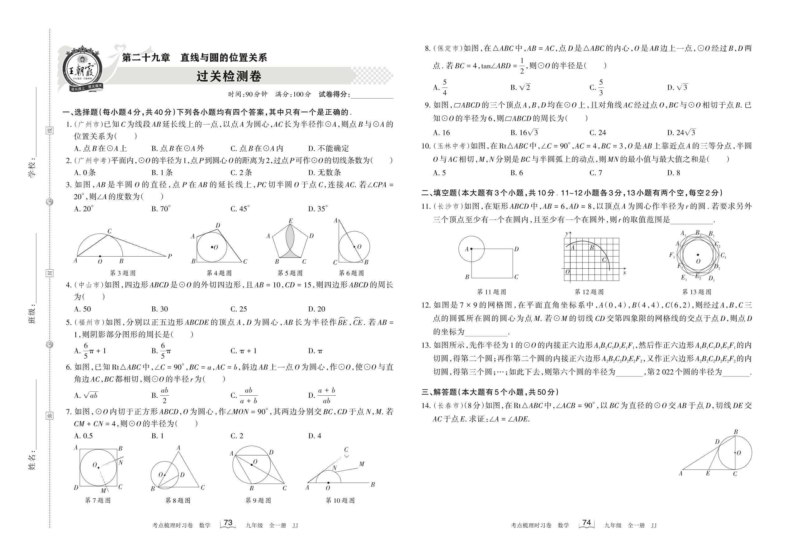 2023春九年级数学冀教版 第二十九章 过关检测卷