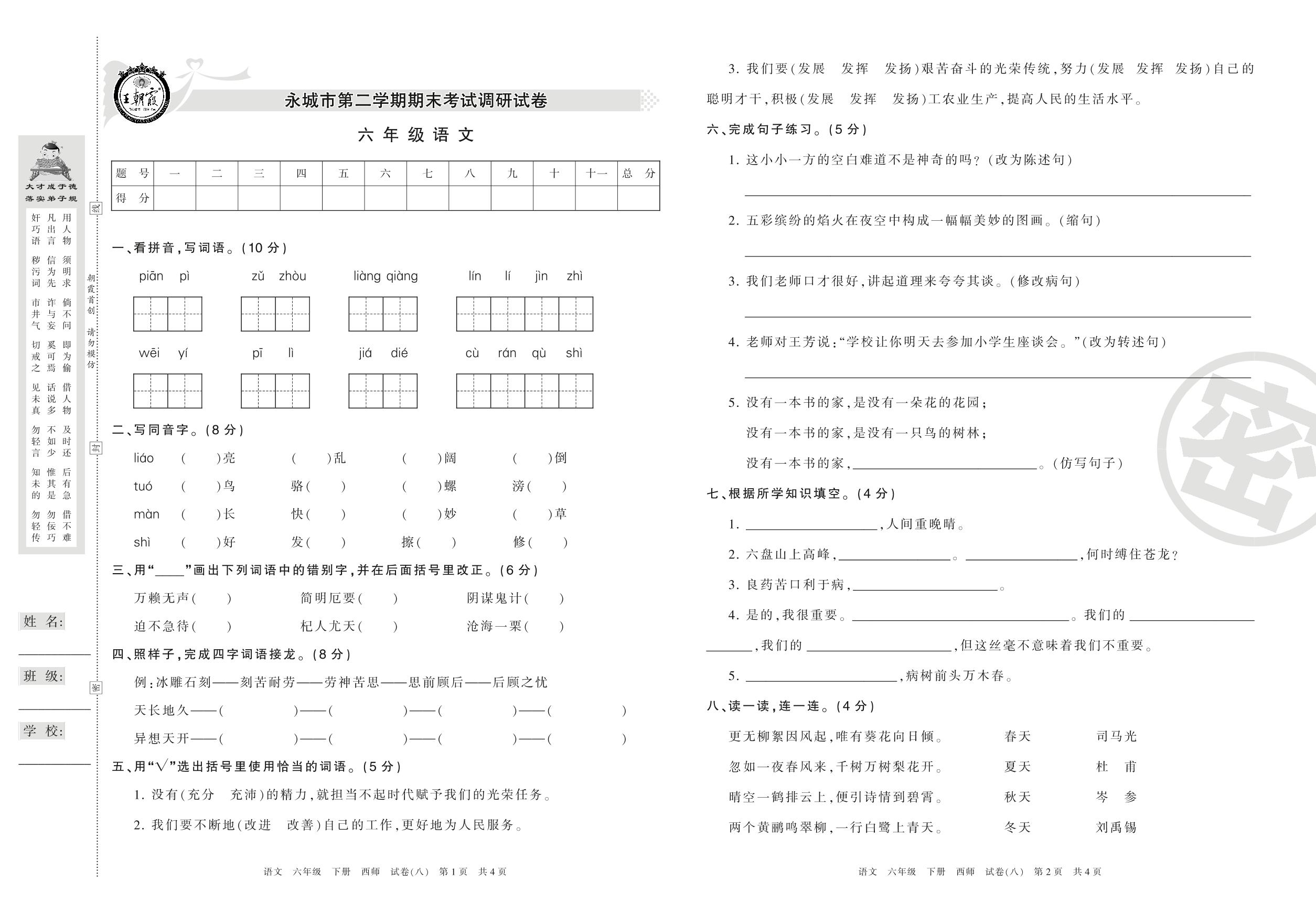 2015-2016学年第二学期永城市六年级语文试卷(西师版)【8】