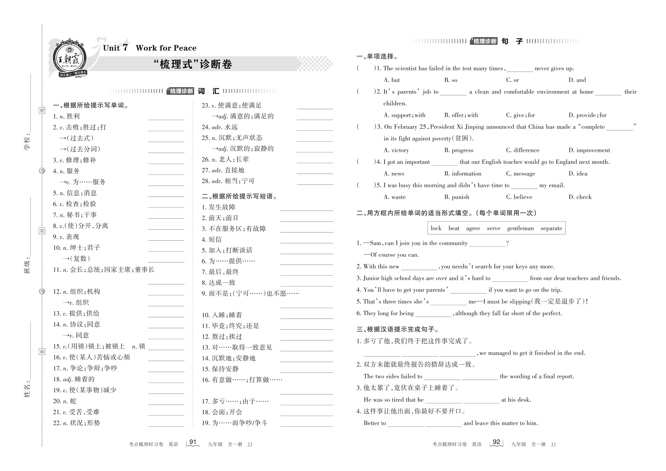 2022-2023学年九年级英语冀教版 Unit 7 “梳理式”诊断卷