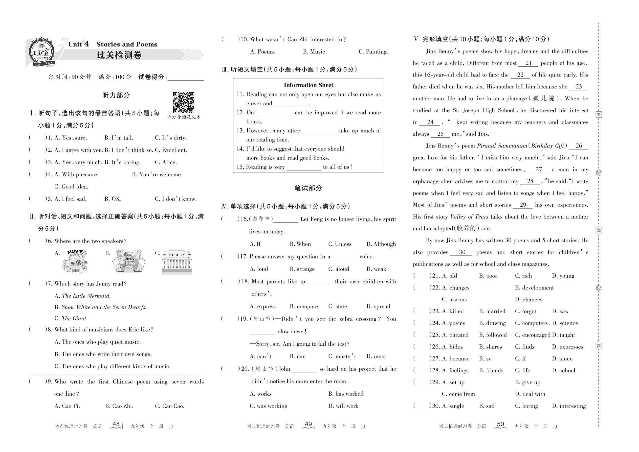 2022-2023学年九年级英语冀教版 Unit 4 过关检测卷