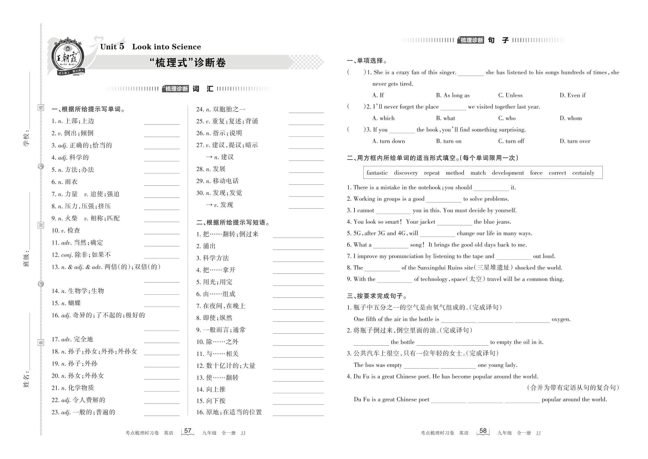 2022-2023学年九年级英语冀教版 Unit 5 “梳理式”诊断卷