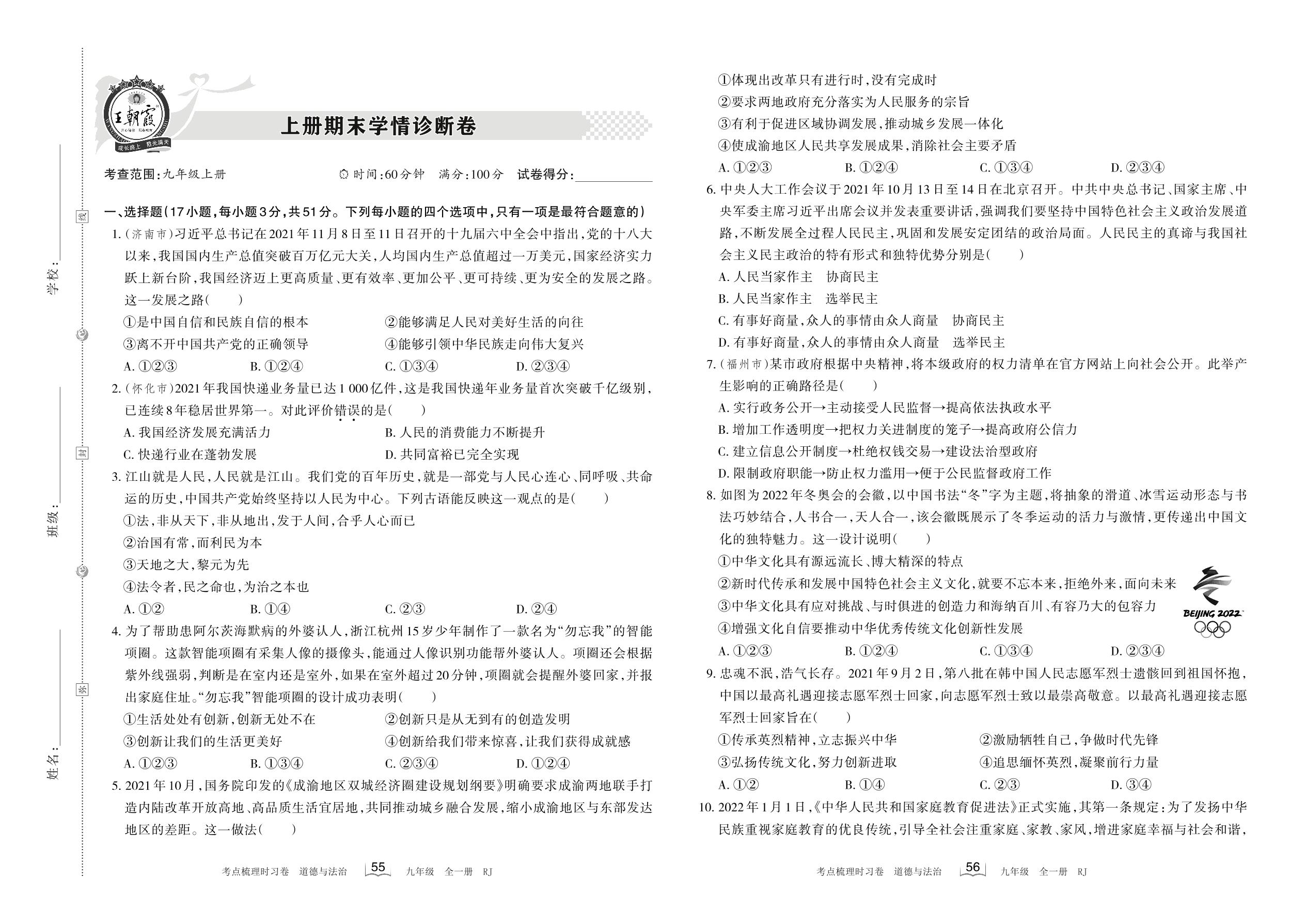 2022上册九年级道德与法治人教版 期末学情诊断卷