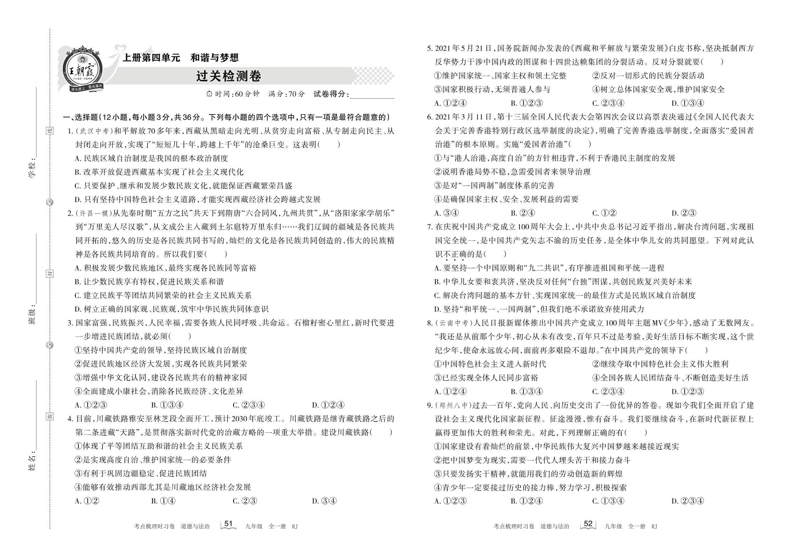 2022上册九年级道德与法治人教版 第四单元 过关检测卷