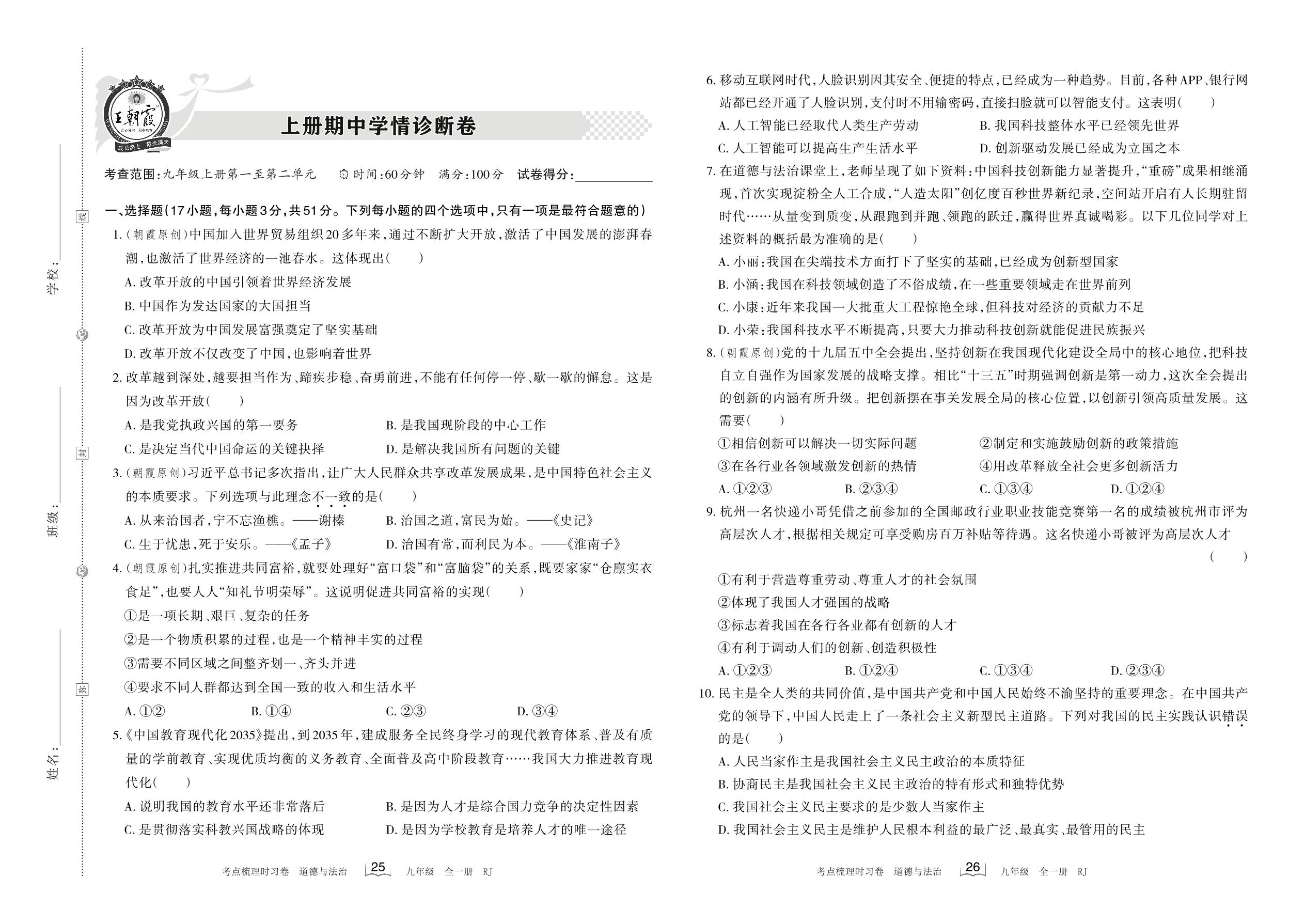 2022上册九年级道德与法治人教版 期中学情诊断卷