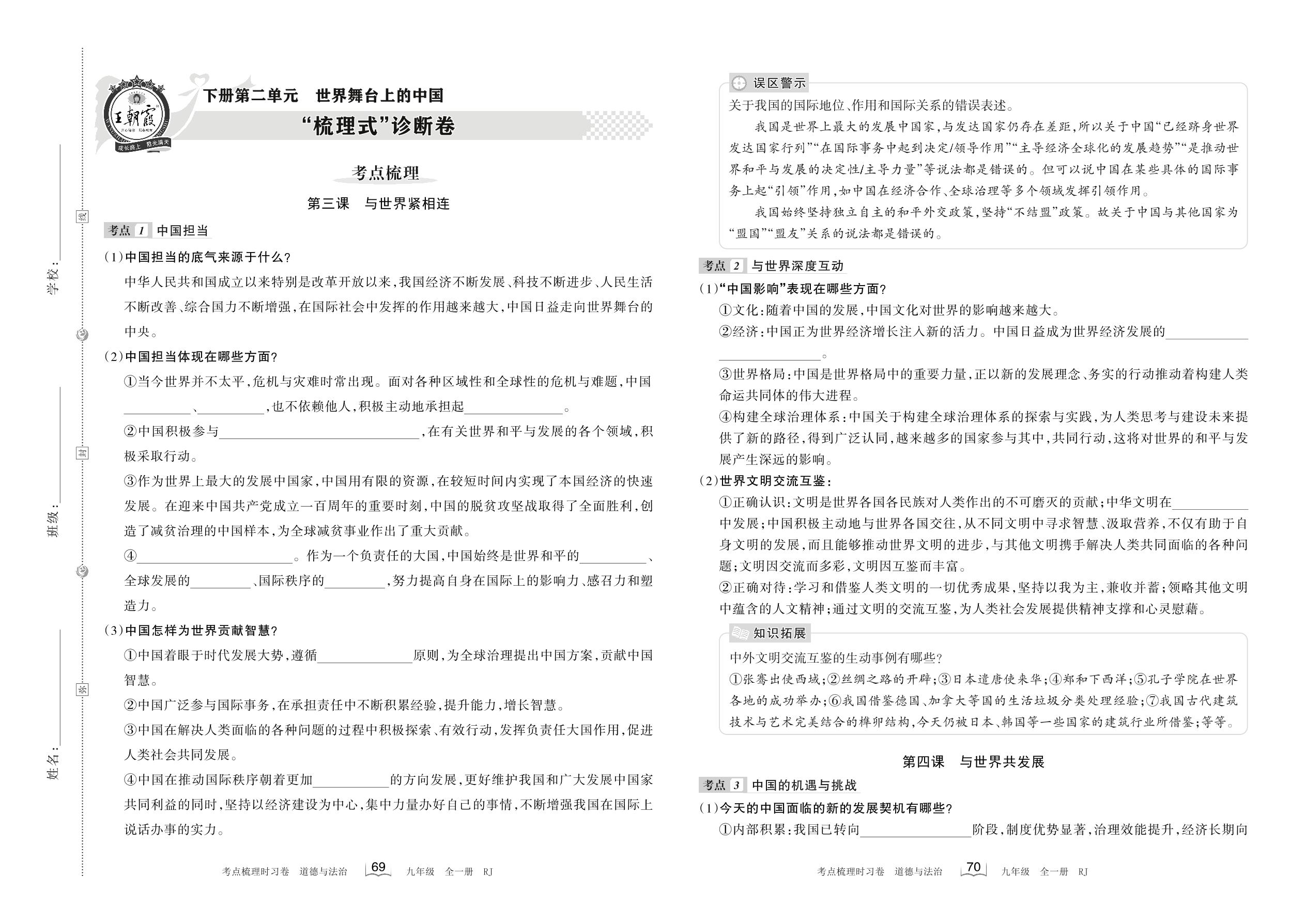 2023下册九年级道德与法治人教版 第二单元 “梳理式”诊断卷