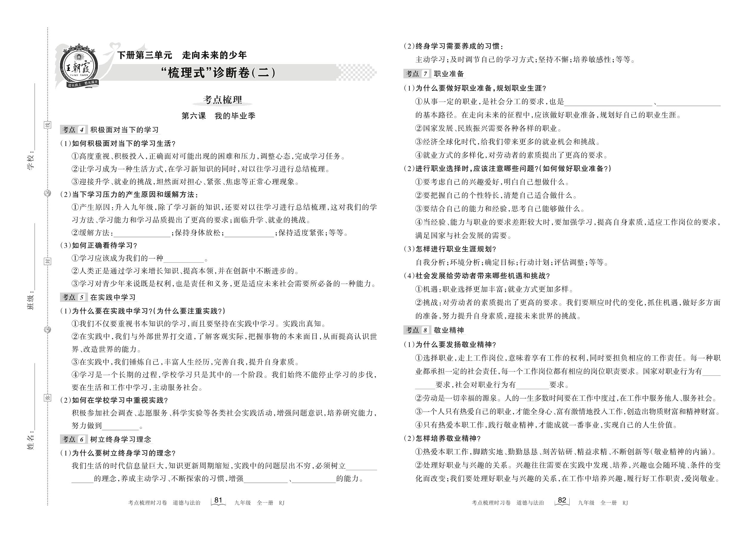 2023下册九年级道德与法治人教版 第三单元 “梳理式”诊断卷(二)