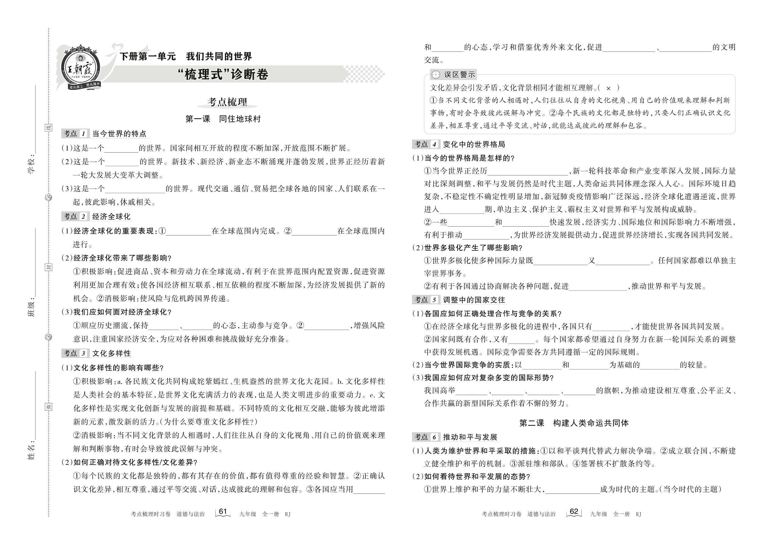 2023下册九年级道德与法治人教版 第一单元 “梳理式”诊断卷