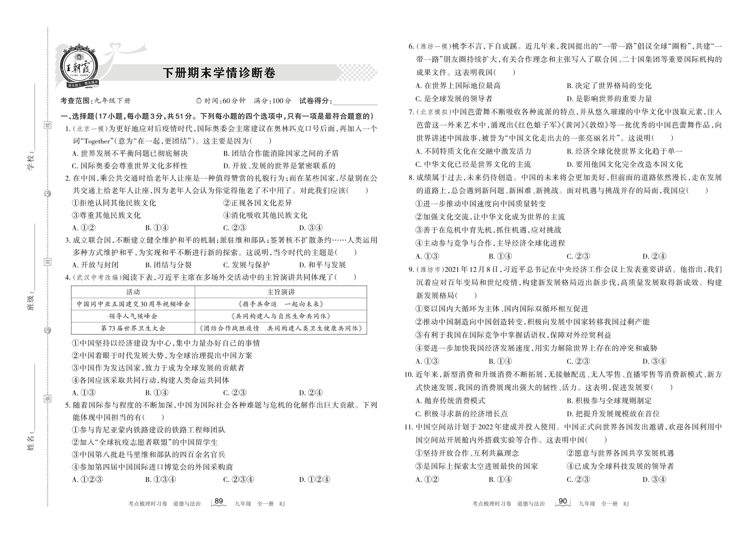 2023下册九年级道德与法治人教版 期末学情诊断卷