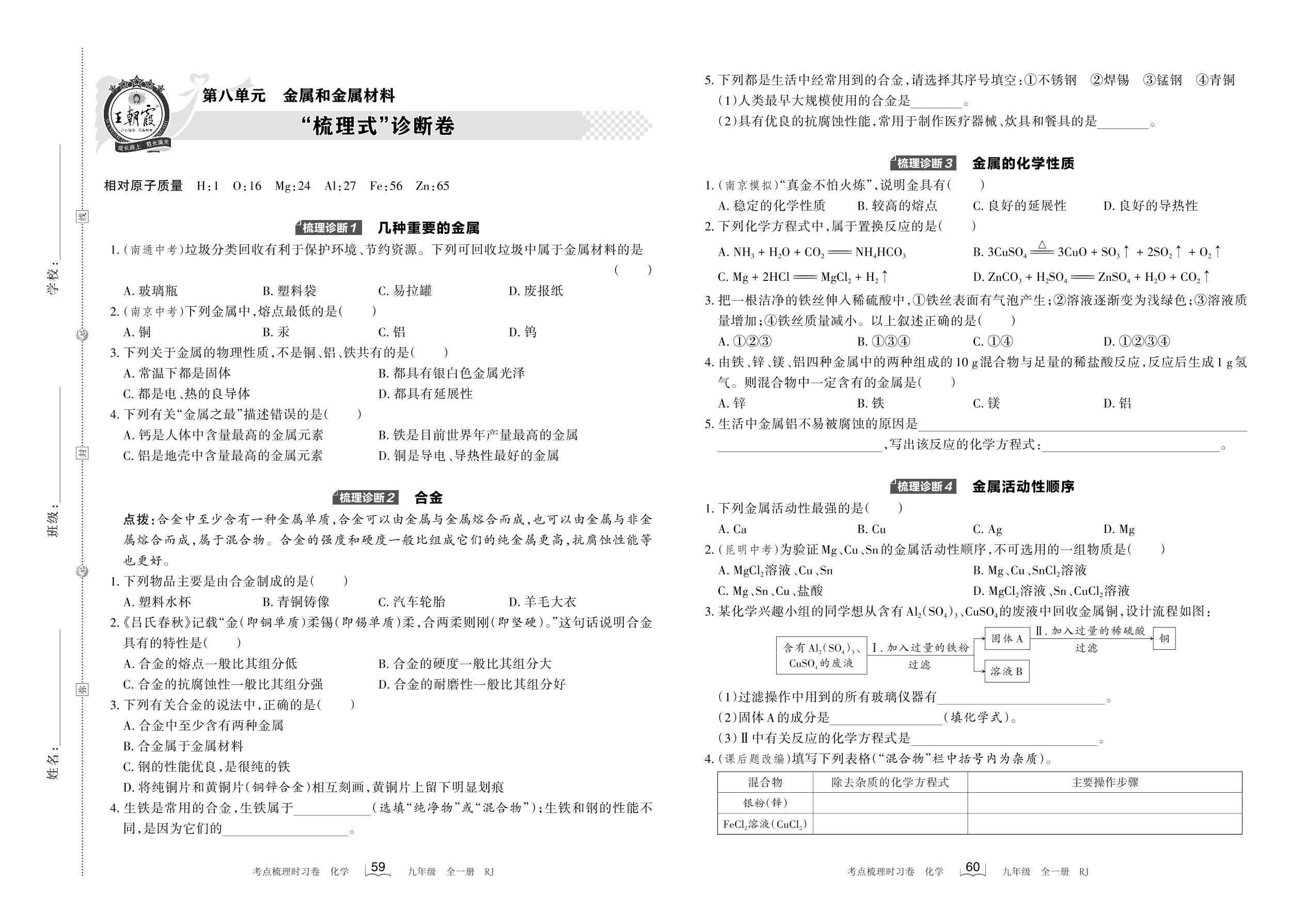 2023春下册九年级化学人教版 第八单元 “梳理式”诊断卷