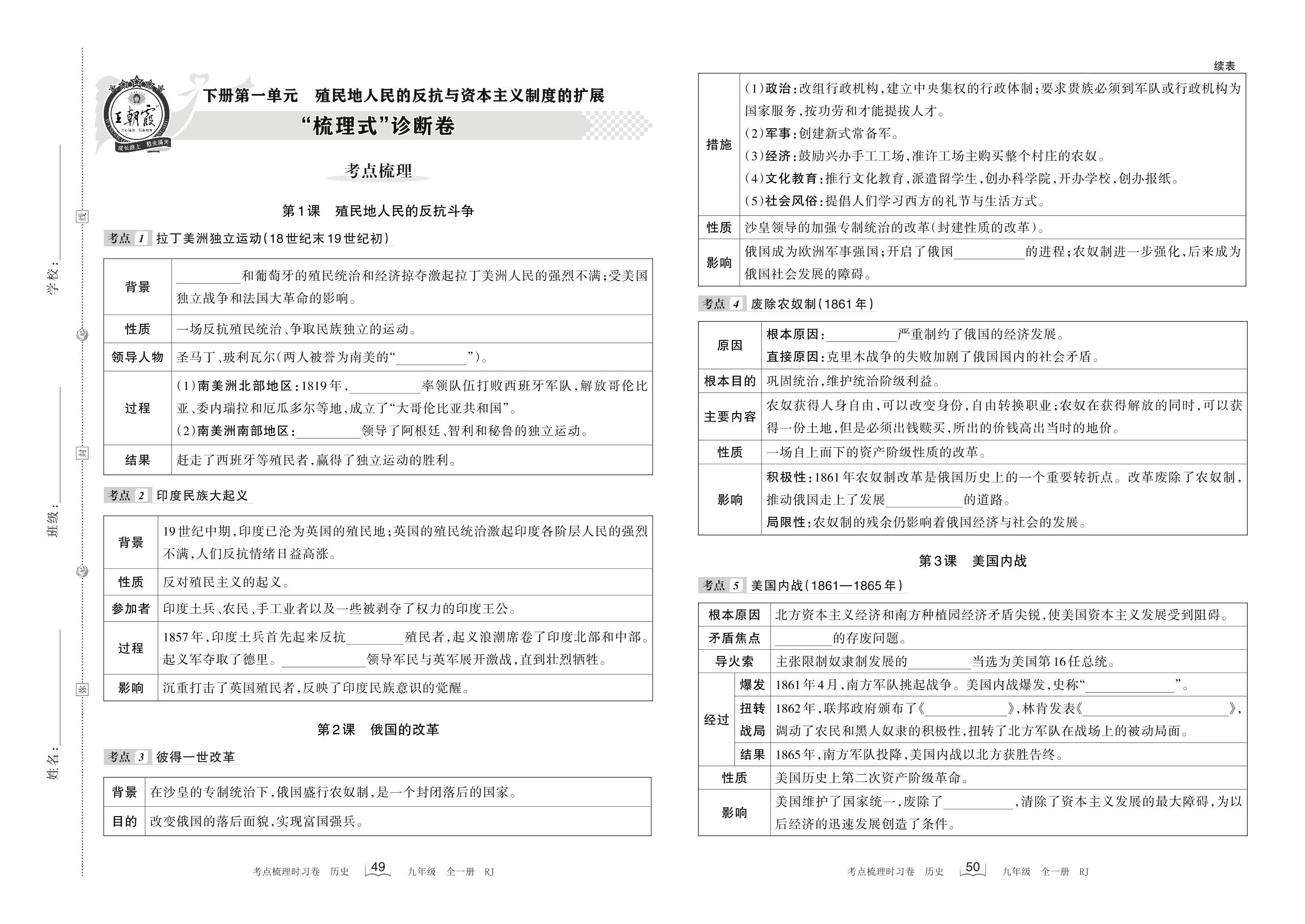 2023下册九年级历史人教版 第一单元 “梳理式”诊断卷