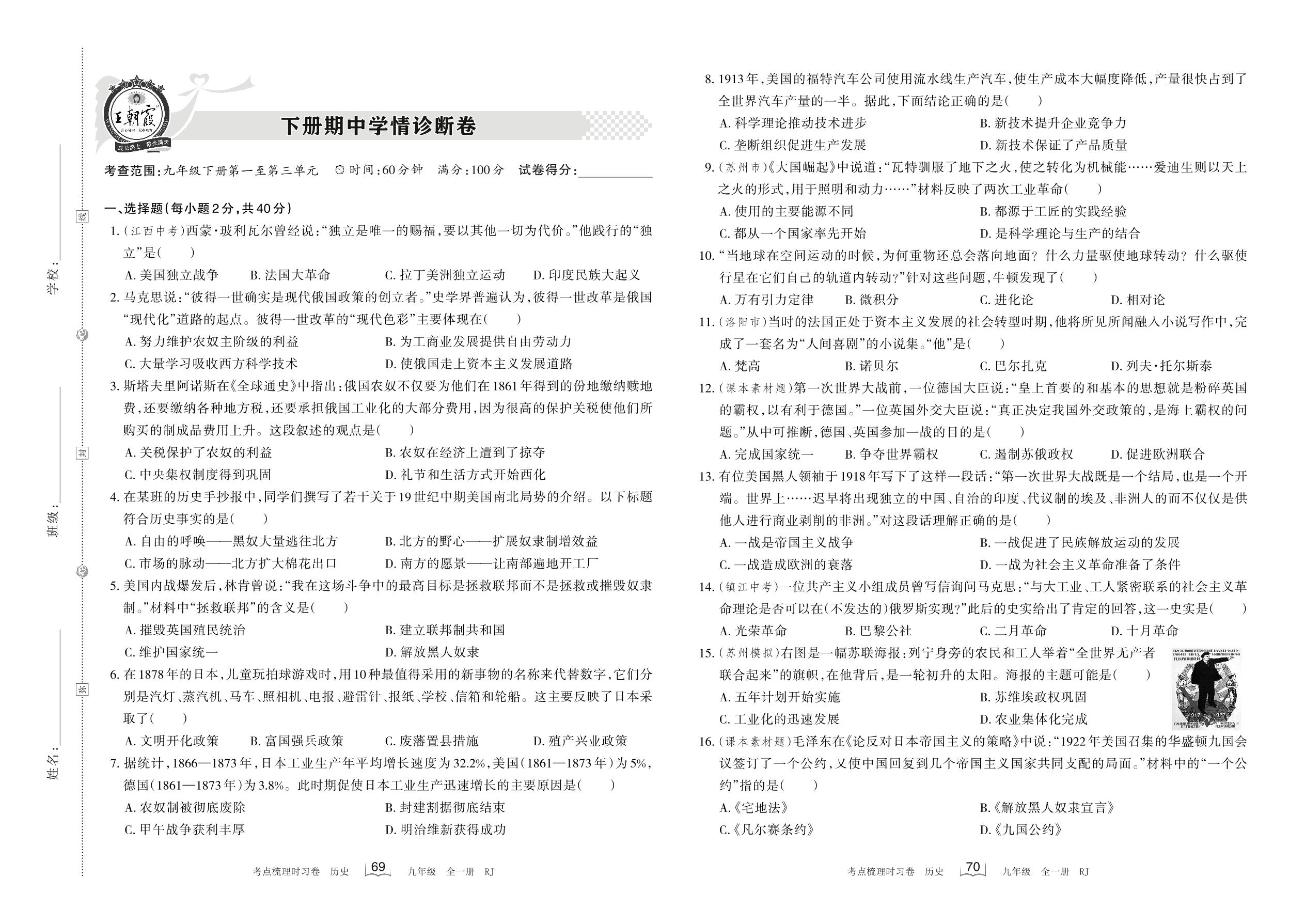 九年级历史人教版下册期中卷