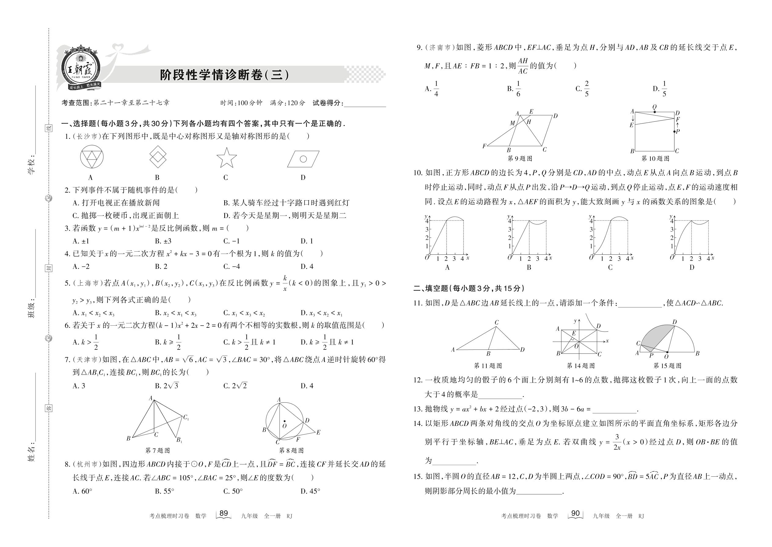 2023春下册九年级数学人教版 阶段性学情诊断卷(三)