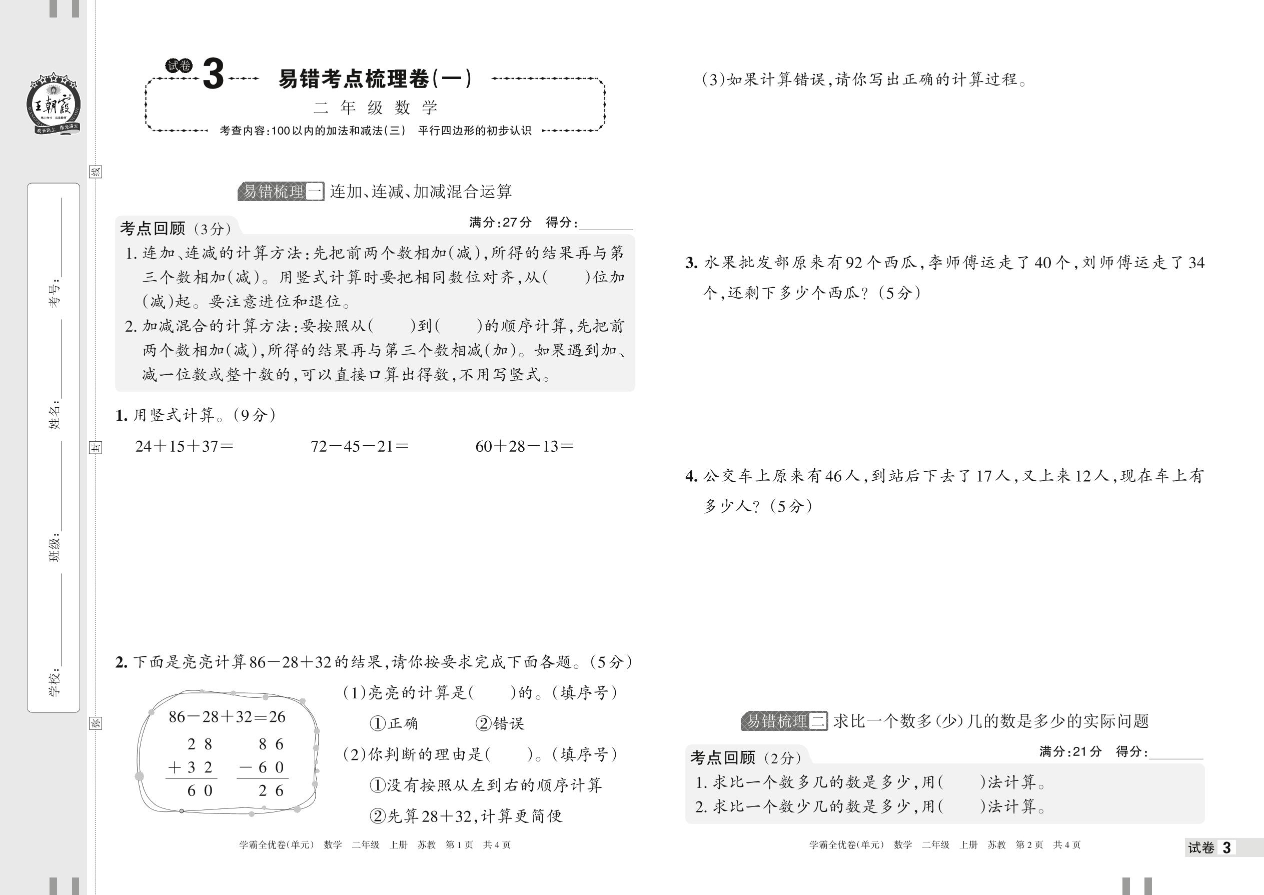 2022上册二年级数学苏教版 试卷3 易错考点梳理卷(一)
