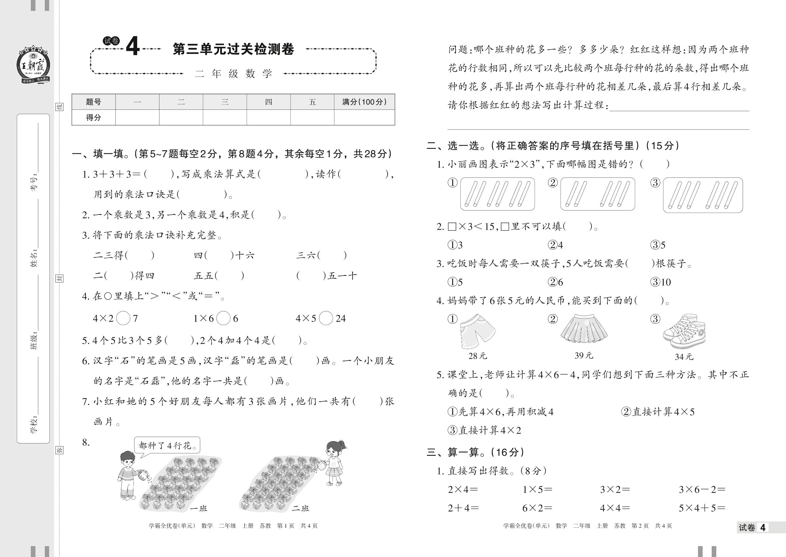 2022上册二年级数学苏教版 试卷4 第三单元过关检测卷