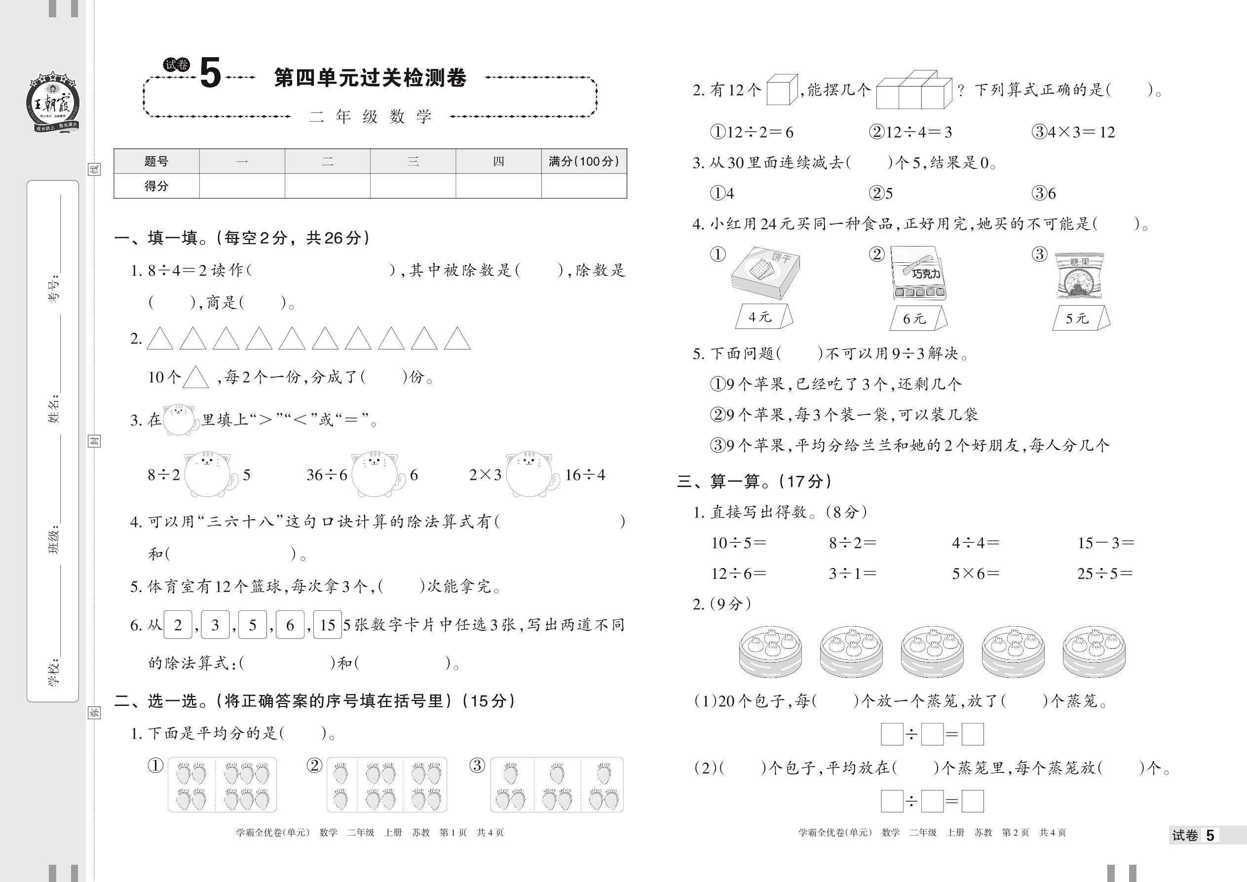 2022上册二年级数学苏教版 试卷5 第四单元过关检测卷
