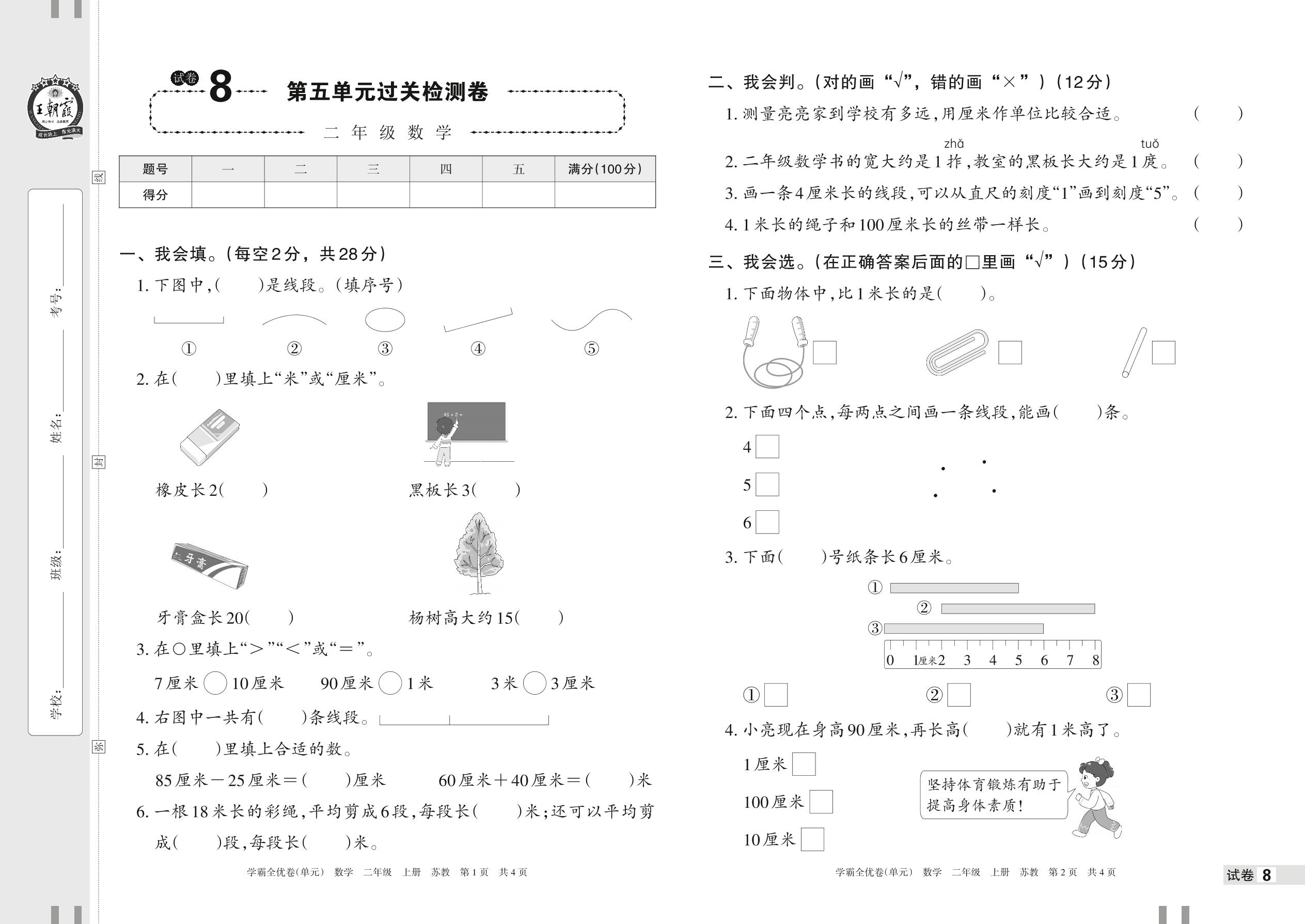 2022上册二年级数学苏教版 试卷8 第五单元过关检测卷