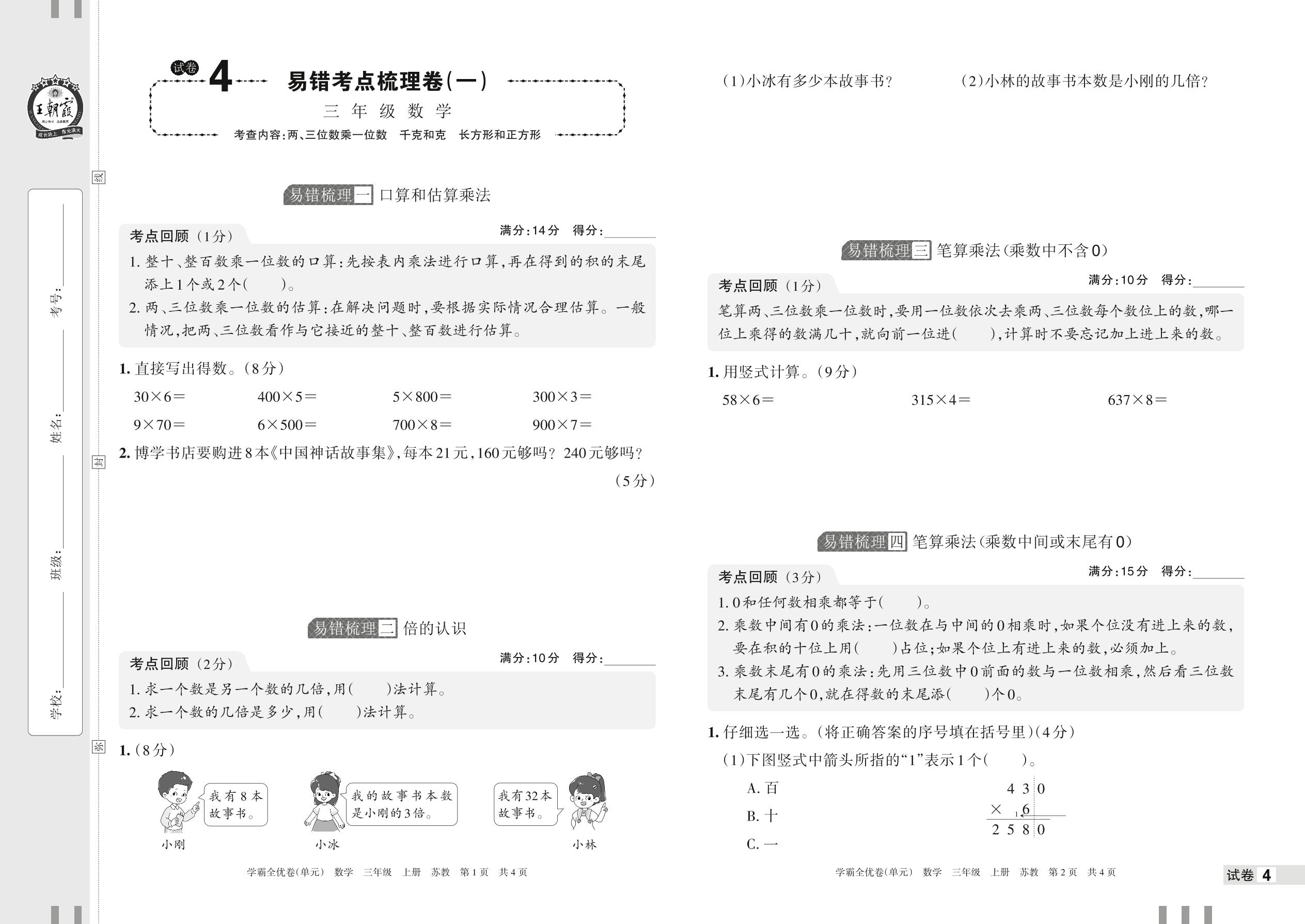 2022上册三年级数学苏教版 试卷4 易错考点梳理卷(一)