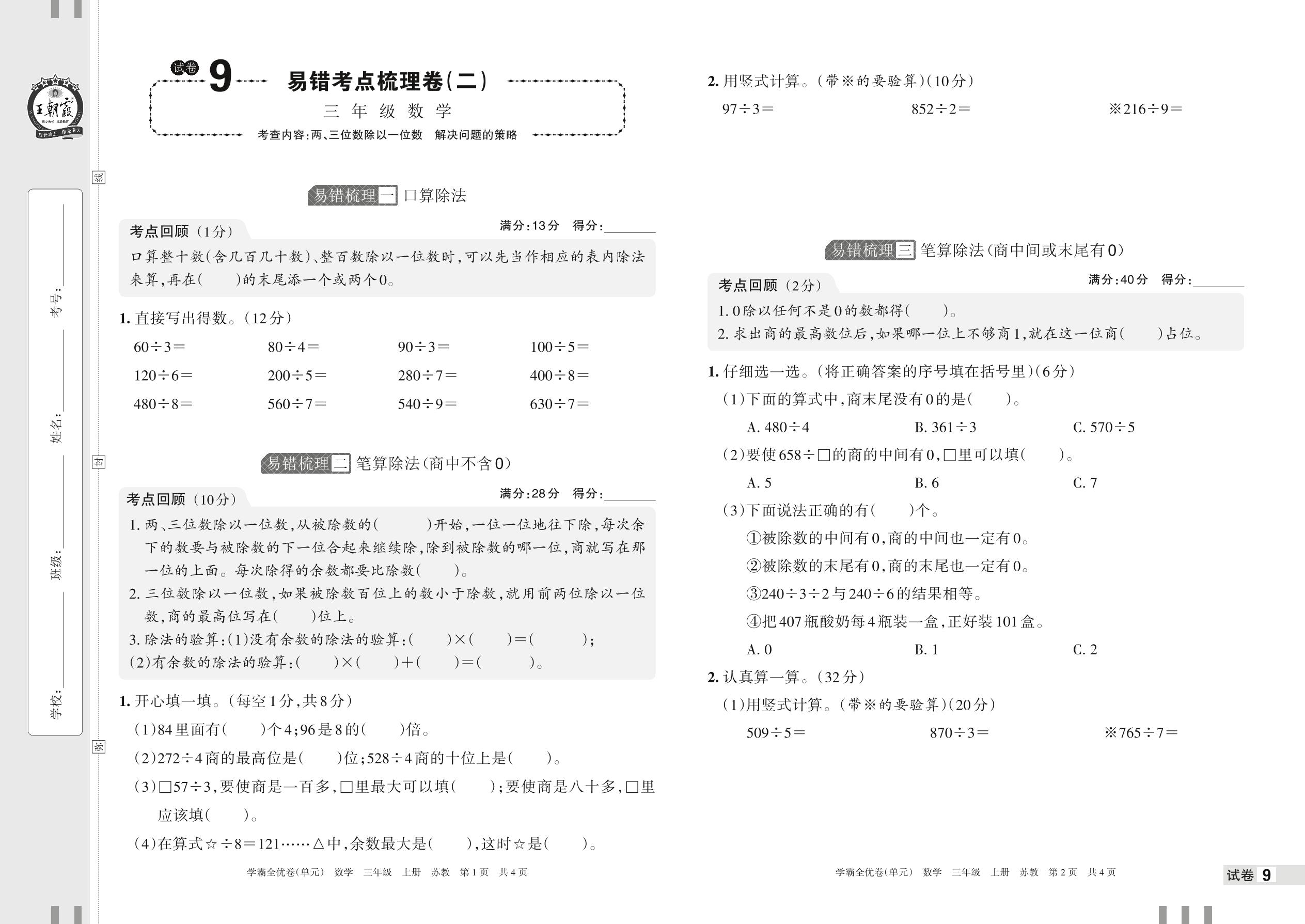 2022上册三年级数学苏教版 试卷9 易错考点梳理卷(二)