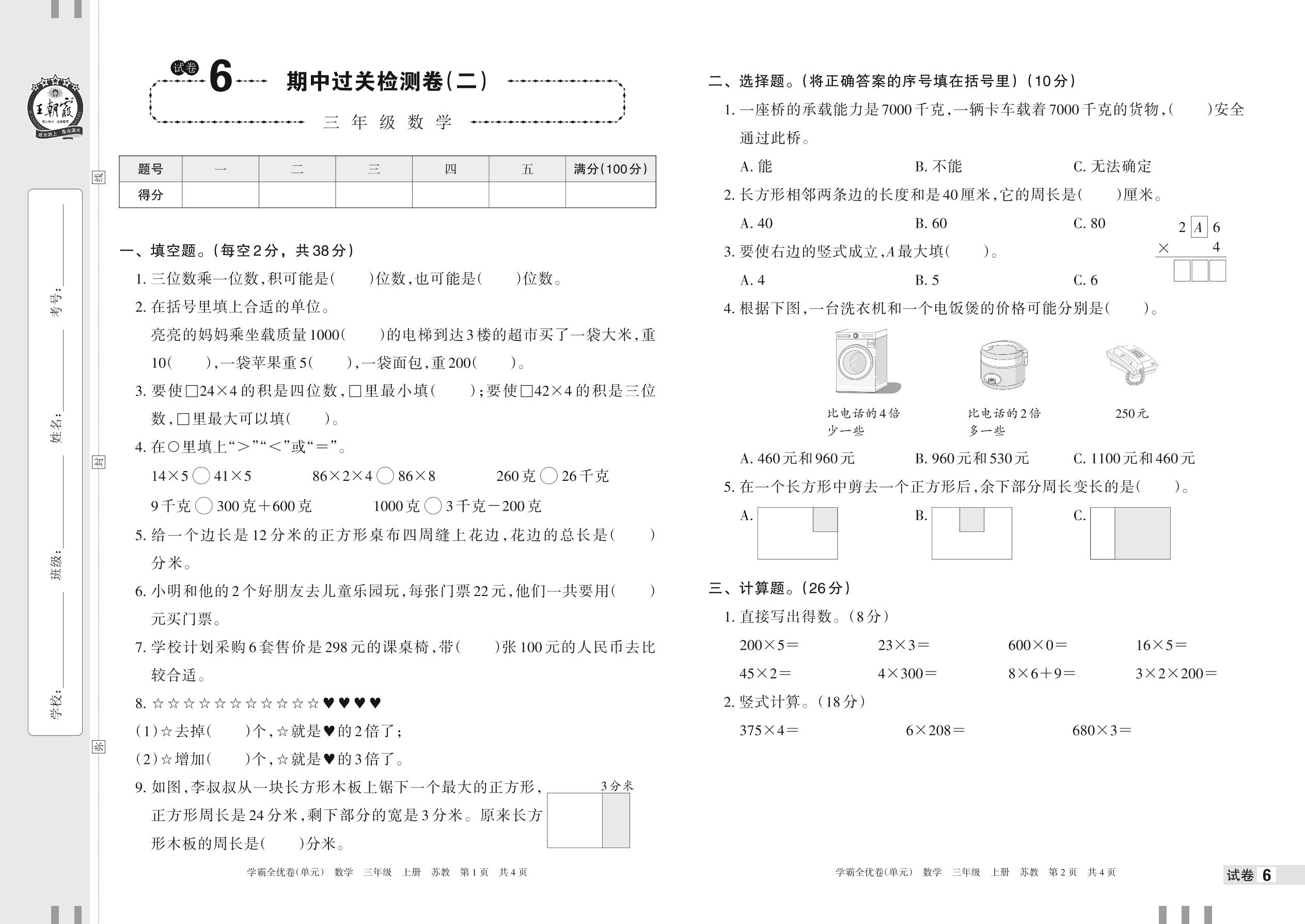 2022上册三年级数学苏教版 试卷6 期中过关检测卷(二)
