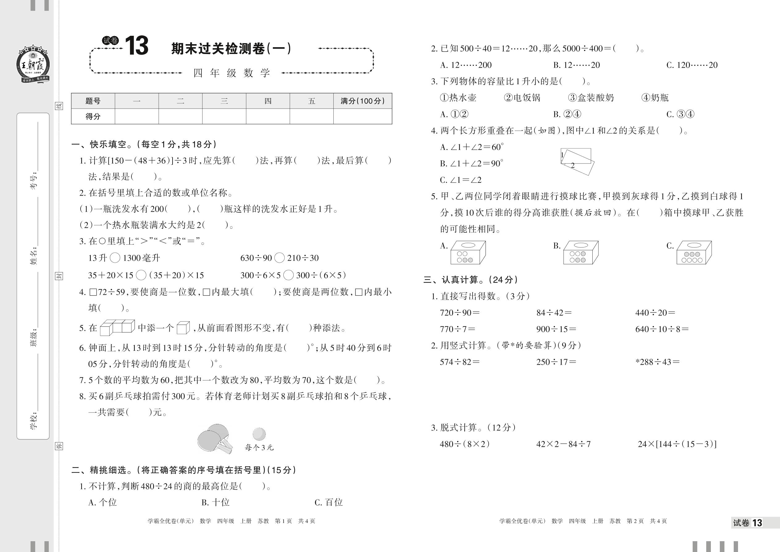 2022上册四年级数学苏教版 试卷13 期末过关检测卷(一)