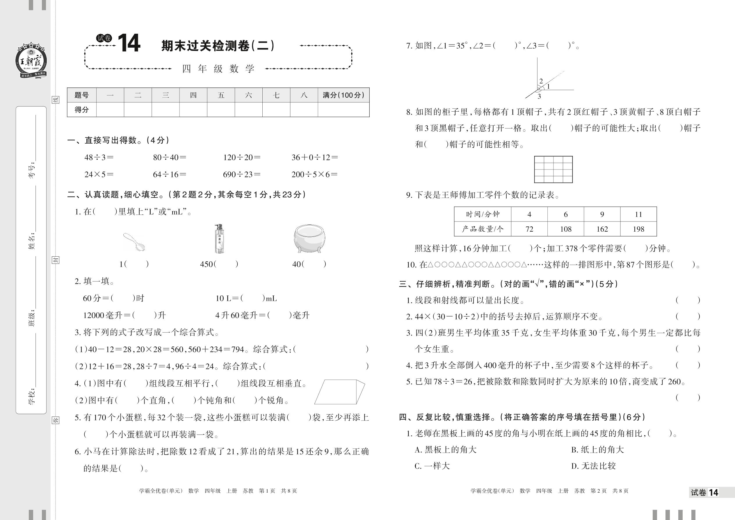 2022上册四年级数学苏教版 试卷14 期末过关检测卷(二)