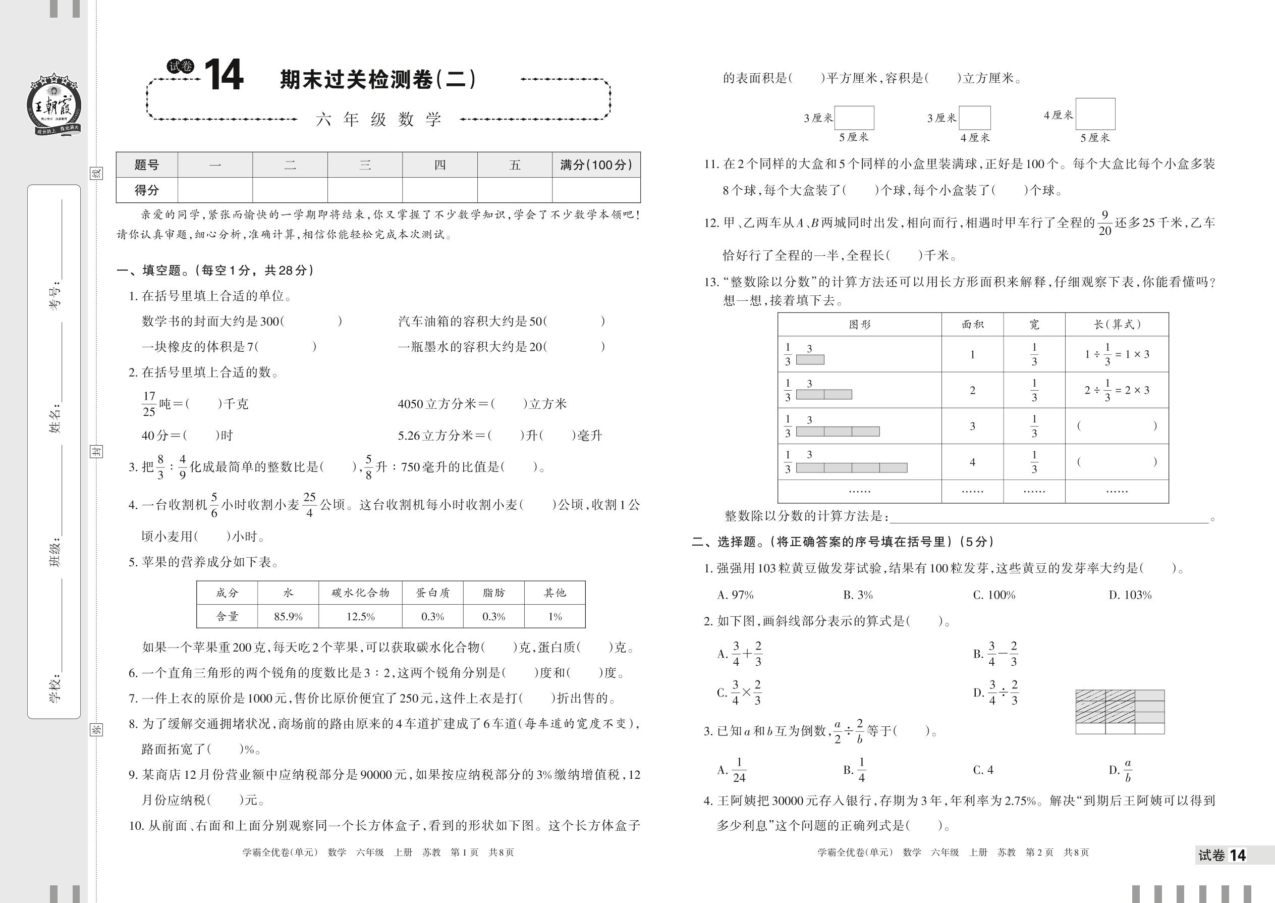 2022上册六年级数学苏教版 试卷14 期末过关检测卷(二)