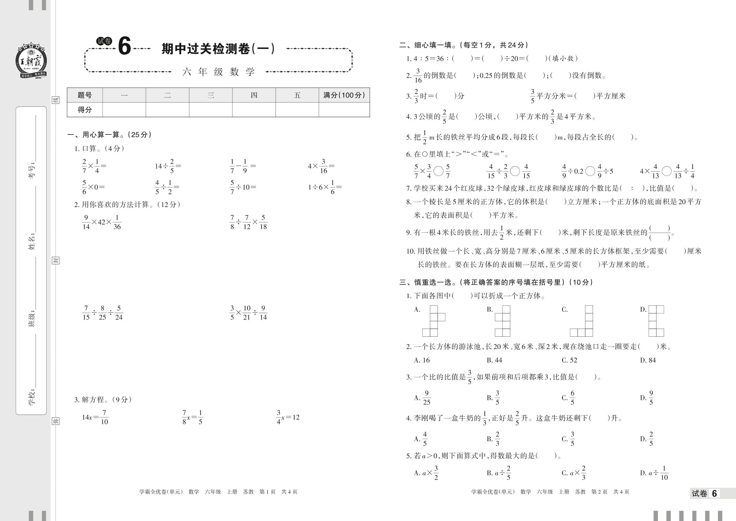 2022上册六年级数学苏教版 试卷6 期中过关检测卷(一)