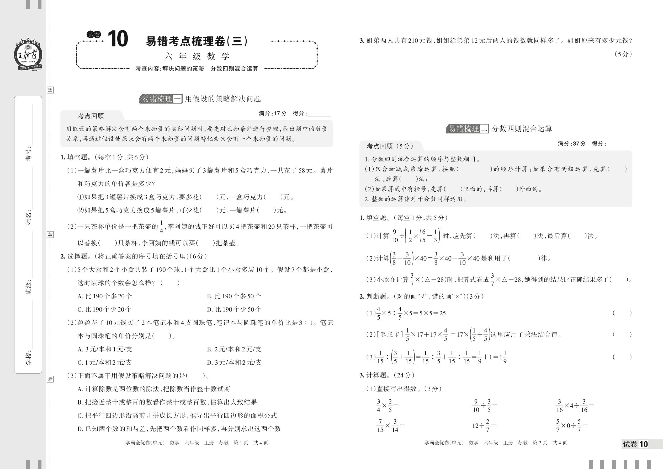2022上册六年级数学苏教版 试卷10 易错考点梳理卷(三)