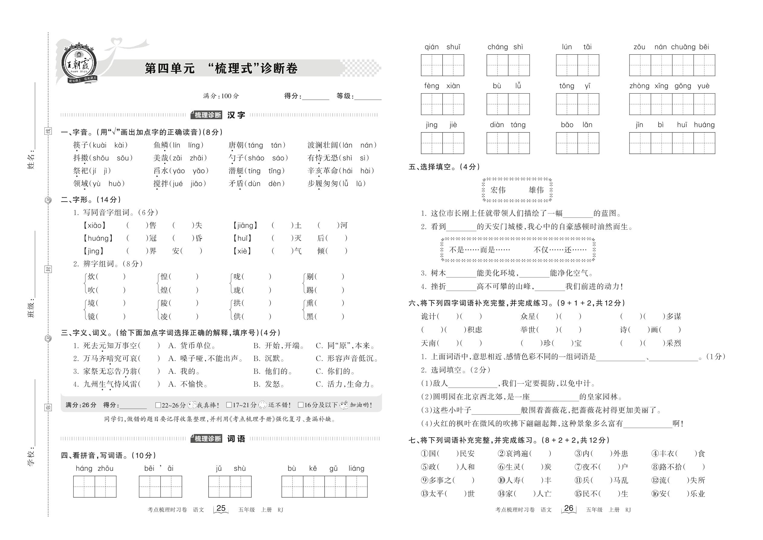 2022上册五年级语文人教版 第四单元 “梳理式”诊断卷