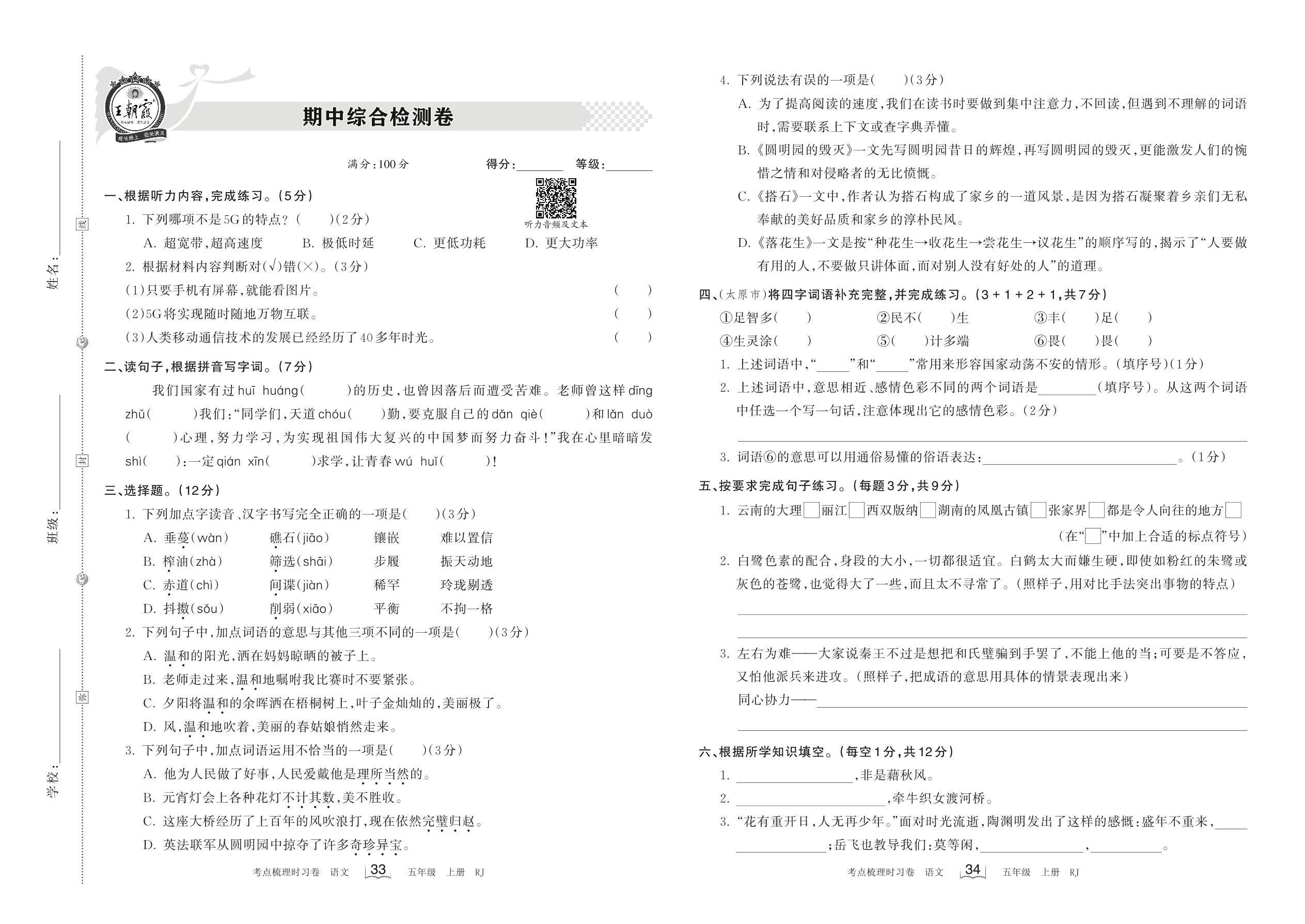 2022上册五年级语文人教版 期中综合检测卷