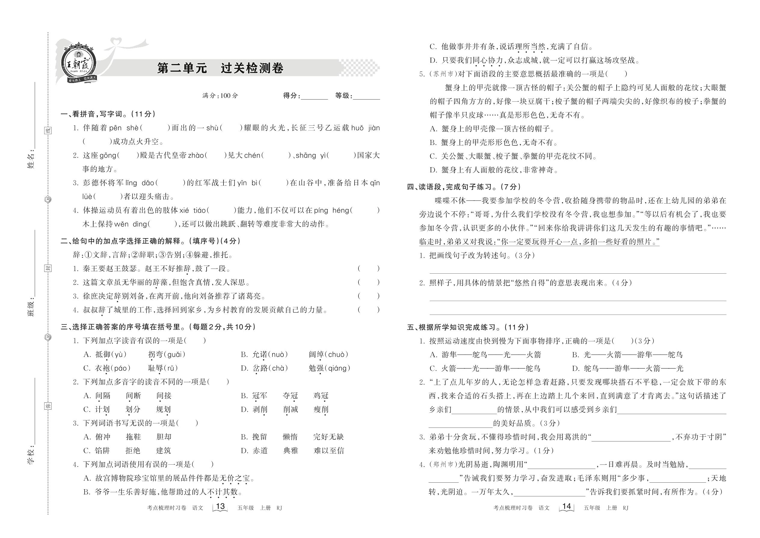 2022上册五年级语文人教版 第二单元 过关检测卷